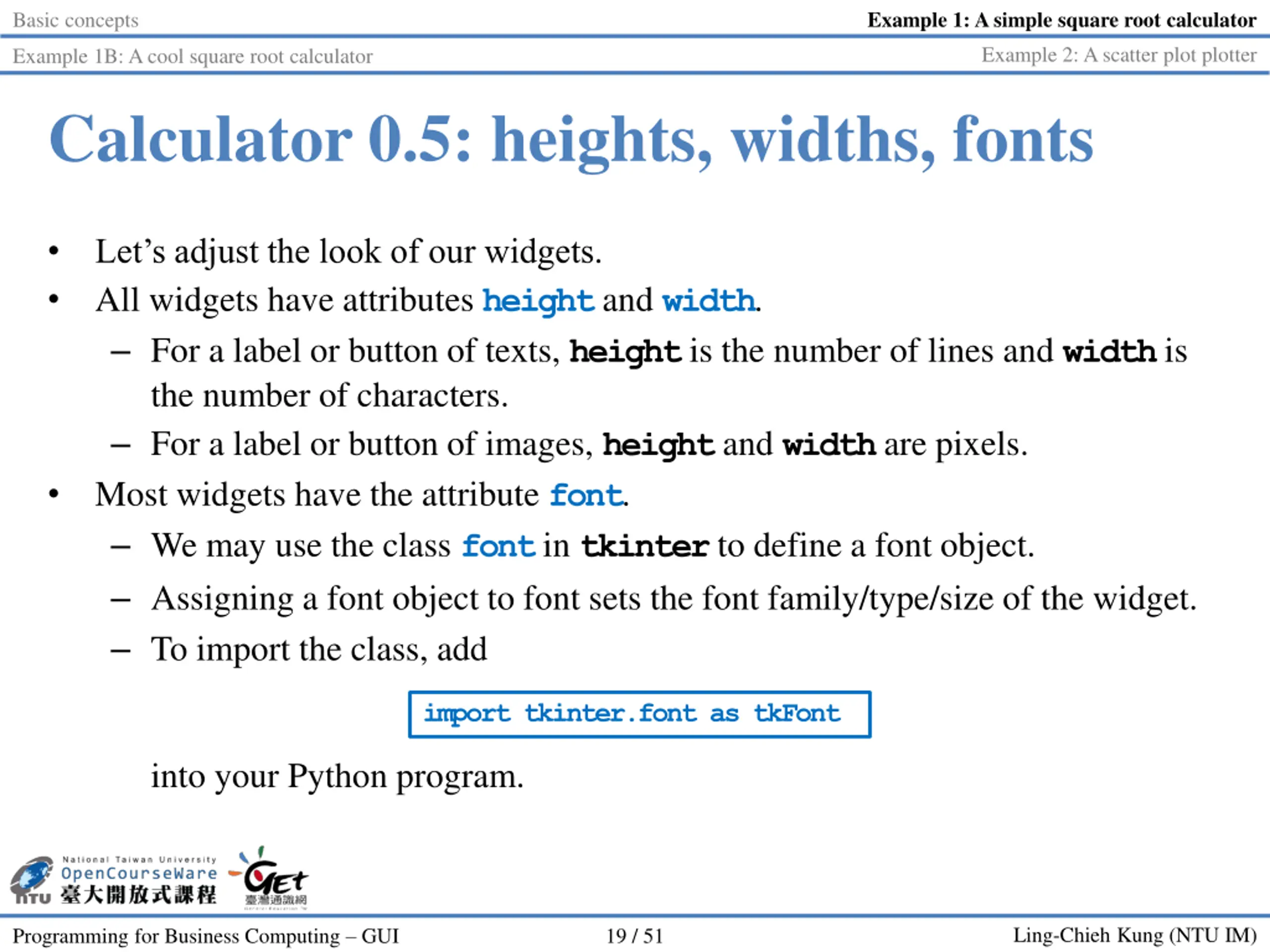 Example 1: A simple square root calculator Basic concepts Example 2: A scatter plot plotter Example 1B: A cool square root calculator Calculator 0.5: heights, widths, fonts Let s adjust the look of our widgets. All widgets have attributes heightand width. For a label or button of texts, heightis the number of lines and widthis the number of characters. For a label or button of images, heightand widthare pixels. Most widgets have the attribute font. We may use the class fontin tkinterto define a font object. Assigning a font object to font sets the font family/type/size of the widget. To import the class, add import tkinter.font as tkFont into your Python program. Ling-Chieh Kung (NTU IM) Programming for Business Computing GUI 19 / 51