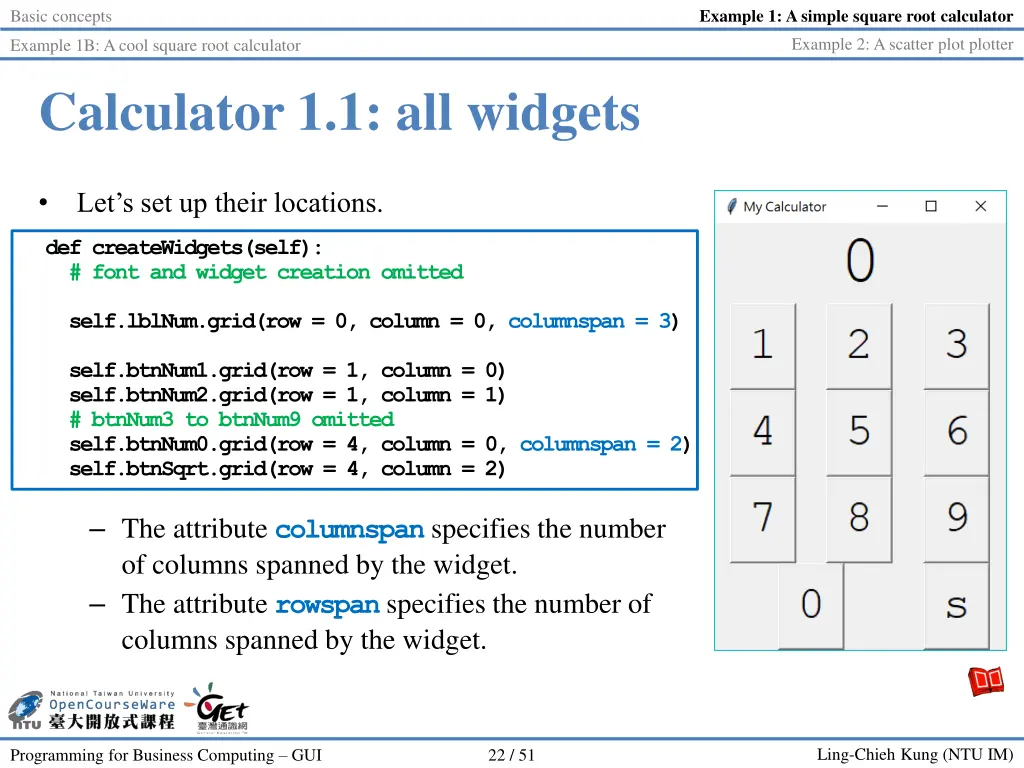 Example 1: A simple square root calculator Basic concepts Example 2: A scatter plot plotter Example 1B: A cool square root calculator Calculator 1.1: all widgets Let s set up their locations. def createWidgets(self): # font and widget creation omitted self.lblNum.grid(row = 0, column = 0, columnspan = 3) self.btnNum1.grid(row = 1, column = 0) self.btnNum2.grid(row = 1, column = 1) # btnNum3 to btnNum9 omitted self.btnNum0.grid(row = 4, column = 0, columnspan = 2) self.btnSqrt.grid(row = 4, column = 2) The attribute columnspan specifies the number of columns spanned by the widget. The attribute rowspanspecifies the number of columns spanned by the widget. Ling-Chieh Kung (NTU IM) Programming for Business Computing GUI 22 / 51