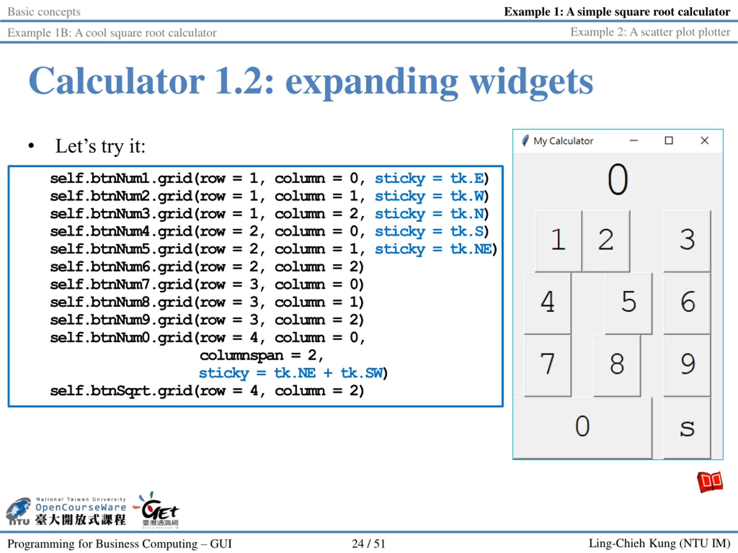 Example 1: A simple square root calculator Basic concepts Example 2: A scatter plot plotter Example 1B: A cool square root calculator Calculator 1.2: expanding widgets Let s try it: self.btnNum1.grid(row = 1, column = 0, sticky = tk.E) self.btnNum2.grid(row = 1, column = 1, sticky = tk.W) self.btnNum3.grid(row = 1, column = 2, sticky = tk.N) self.btnNum4.grid(row = 2, column = 0, sticky = tk.S) self.btnNum5.grid(row = 2, column = 1, sticky = tk.NE) self.btnNum6.grid(row = 2, column = 2) self.btnNum7.grid(row = 3, column = 0) self.btnNum8.grid(row = 3, column = 1) self.btnNum9.grid(row = 3, column = 2) self.btnNum0.grid(row = 4, column = 0, columnspan = 2, sticky = tk.NE + tk.SW) self.btnSqrt.grid(row = 4, column = 2) Ling-Chieh Kung (NTU IM) Programming for Business Computing GUI 24 / 51