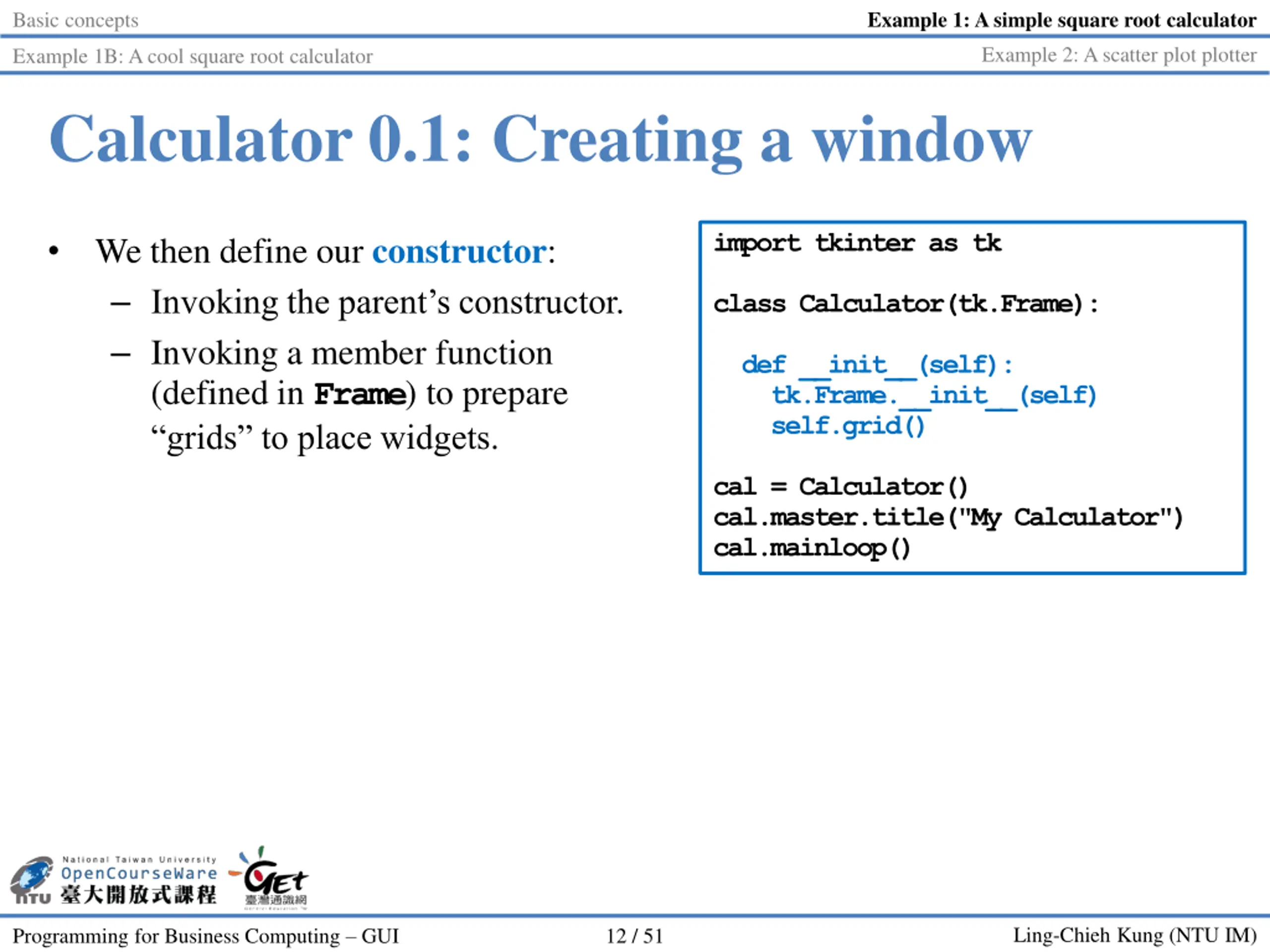 Example 1: A simple square root calculator Basic concepts Example 2: A scatter plot plotter Example 1B: A cool square root calculator Calculator 0.1: Creating a window import tkinter as tk We then define our constructor: Invoking the parent s constructor. Invoking a member function (defined in Frame) to prepare grids to place widgets. class Calculator(tk.Frame): def __init__(self): tk.Frame.__init__(self) self.grid() cal = Calculator() cal.master.title("My Calculator") cal.mainloop() Ling-Chieh Kung (NTU IM) Programming for Business Computing GUI 12 / 51