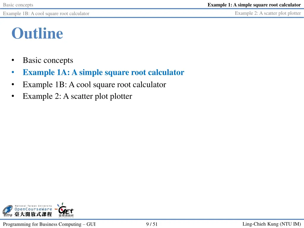 Basic concepts Example 1: A simple square root calculator Example 2: A scatter plot plotter Example 1B: A cool square root calculator Outline Basic concepts Example 1A: A simple square root calculator Example 1B: A cool square root calculator Example 2: A scatter plot plotter Ling-Chieh Kung (NTU IM) Programming for Business Computing GUI 2 / 51
