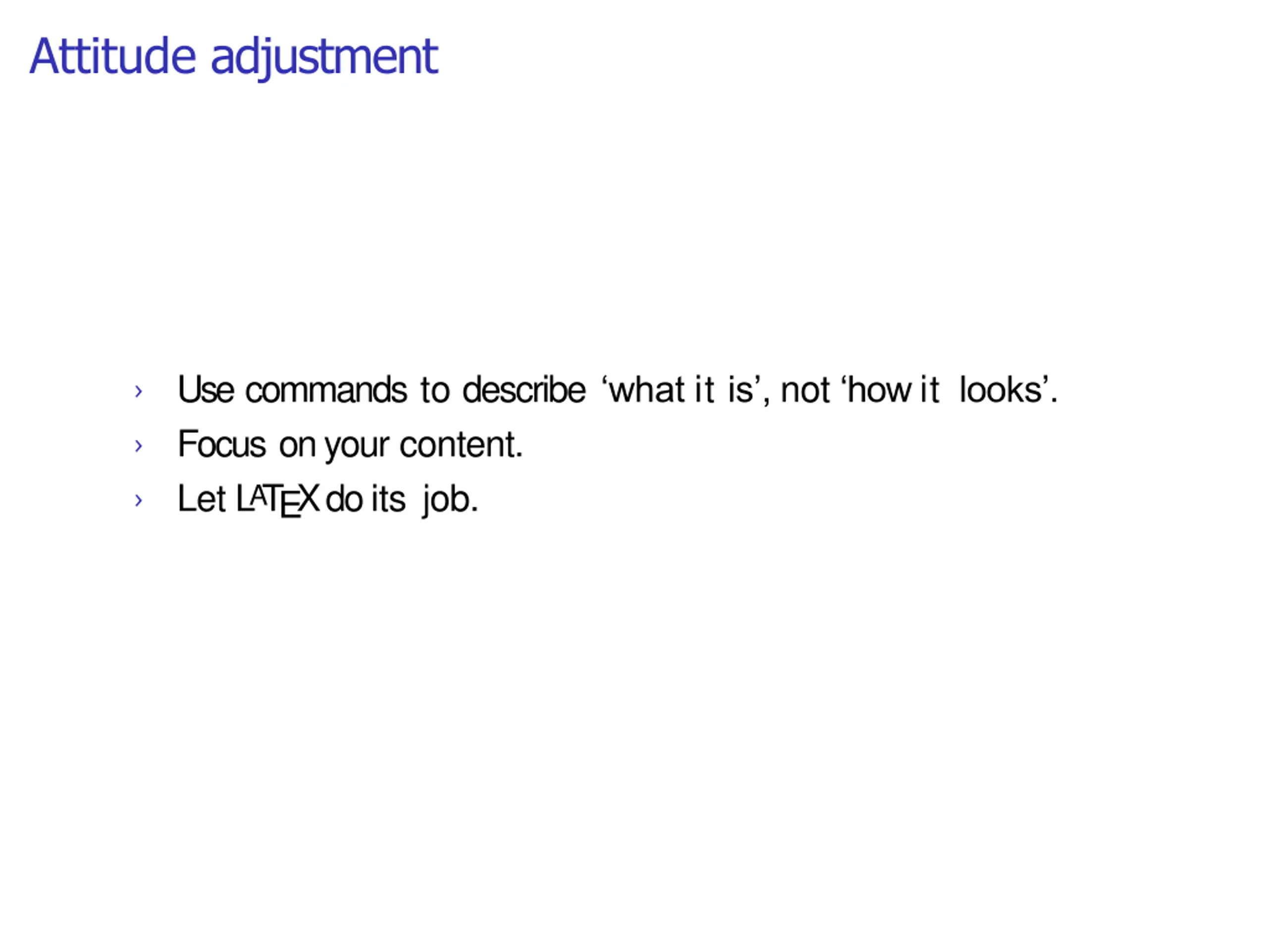 Attitude adjustment Use commands to describe what it is , not how it looks . Focus on your content. Let LATEX do its job.