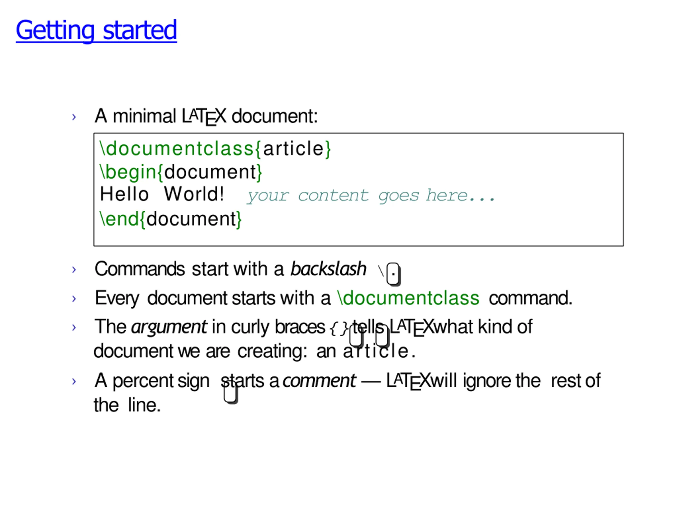 Getting started A minimal LATEX document: \documentclass{article} \begin{document} Hello World! your content goes here... \end{document} Commands start with a backslash \ . Every document starts with a \documentclass command. The argument in curly braces { } tells LATEX what kind of document we are creating: an article. A percent sign starts a comment LATEX will ignore the rest of the line.