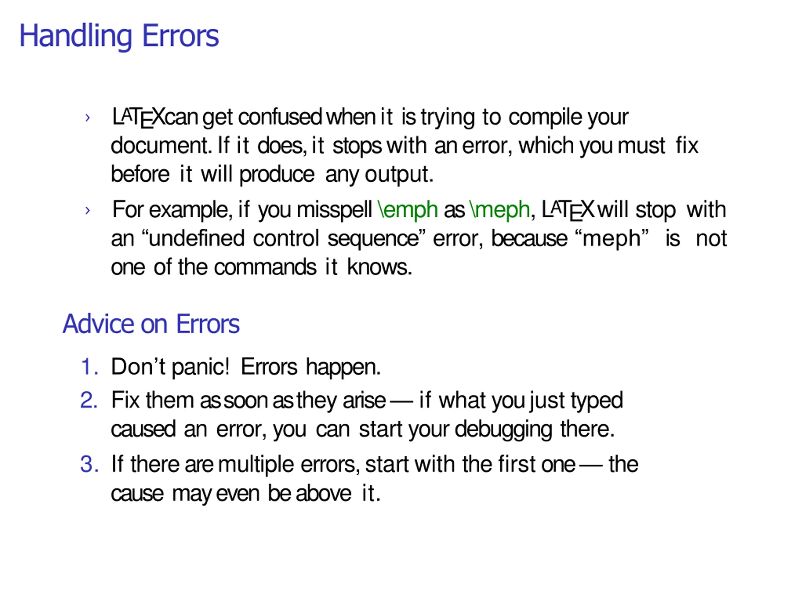 Handling Errors LATEX can get confused when it is trying to compile your document. If it does, it stops with an error, which you must fix before it will produce any output. Forexample,if youmisspell \emph as\meph,LATEXwill stop with an undefined control sequence error, because meph is not one of the commands it knows. Advice on Errors 1. Don t panic! Errors happen. 2. Fix them as soon as they arise if what you just typed caused an error, you can start your debugging there. 3. If there are multiple errors, start with the first one the cause may even be above it.