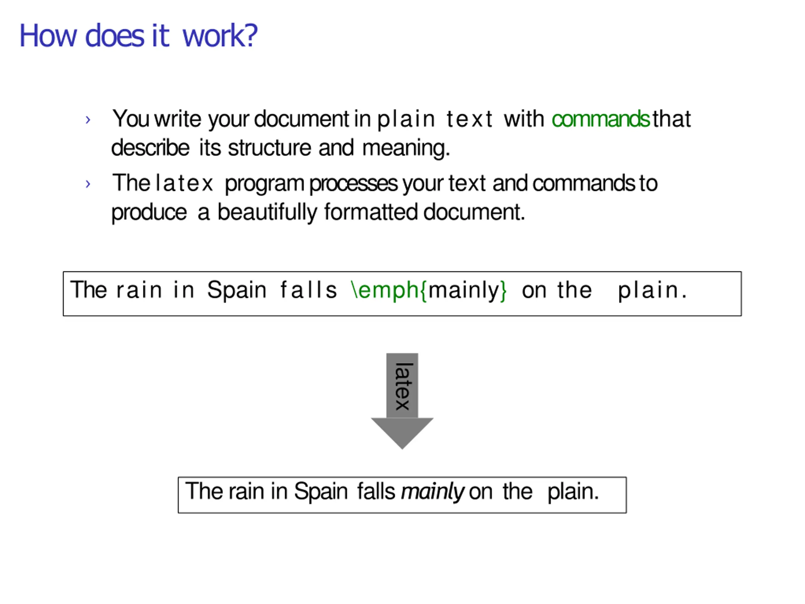 How does it work? You write your document in plain text with commands that describe its structure and meaning. The latex program processes your text and commands to produce a beautifully formatteddocument. The rain in Spain falls \emph{mainly} on the plain. latex The rain in Spain falls mainly on the plain.