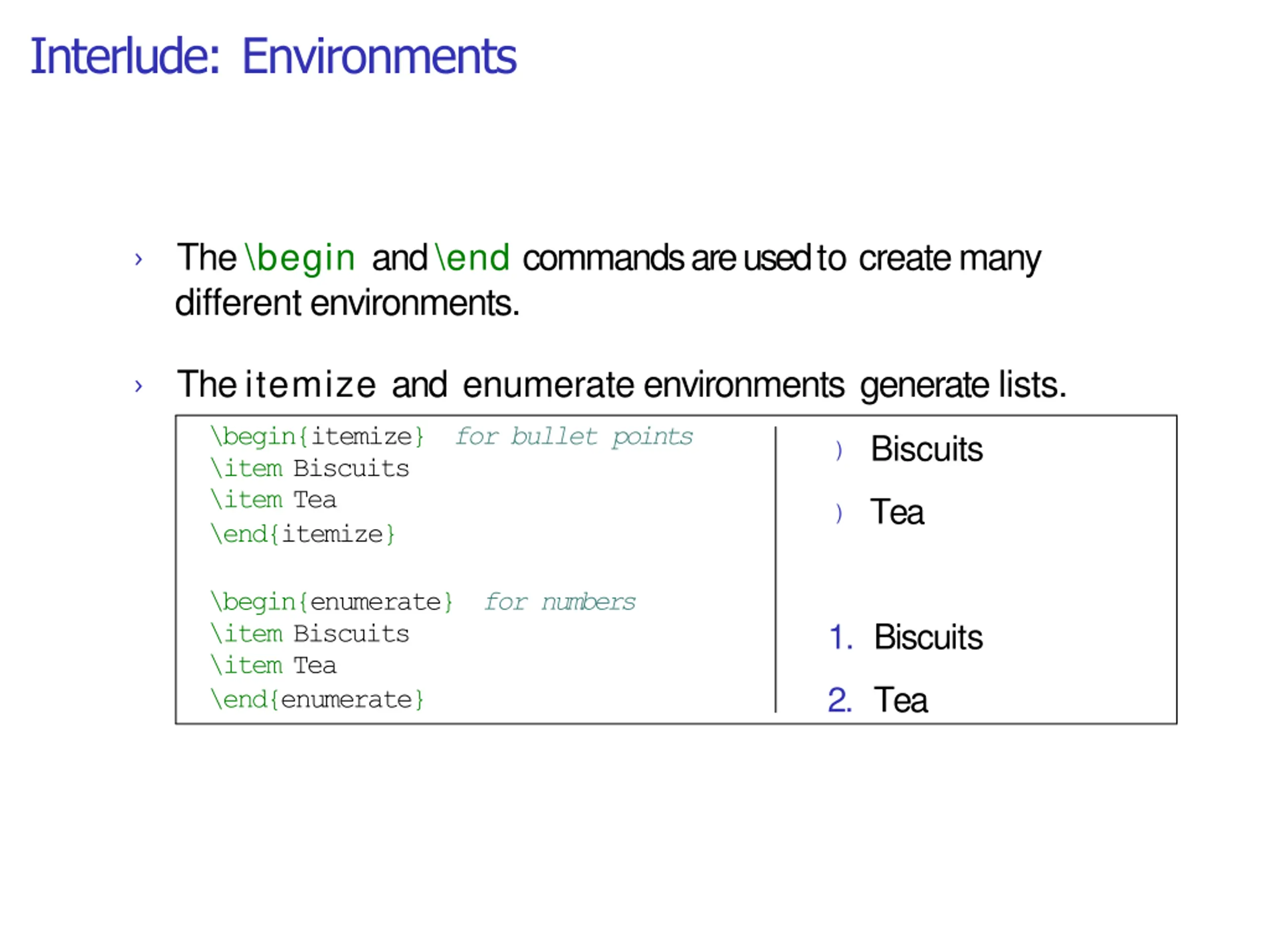 Interlude: Environments The \begin and \end commands are used to create many different environments. The itemize and enumerate environments generate lists. \begin{itemize} for bullet points \item Biscuits \item Tea \end{itemize} ) Biscuits ) Tea \begin{enumerate} for numbers \item Biscuits \item Tea \end{enumerate} 1. Biscuits 2. Tea