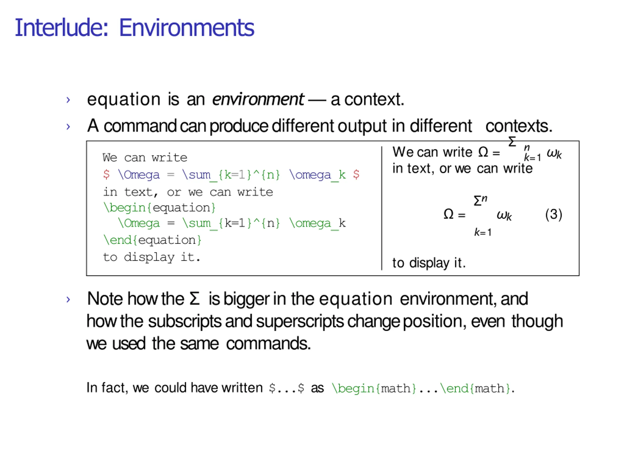 Interlude: Environments equation is an environment a context. A command can produce different output in different contexts. n We can write = in text, or we can write k We can write $ \Omega = \sum_{k=1}^{n} \omega_k $ in text, or we can write \begin{equation} \Omega = \sum_{k=1}^{n} \omega_k \end{equation} to display it. k=1 n = (3) k k=1 to display it. Note how the is bigger in the equation environment, and how the subscripts and superscripts change position, even though we used the same commands. In fact, we could have written $...$ as \begin{math}...\end{math}.