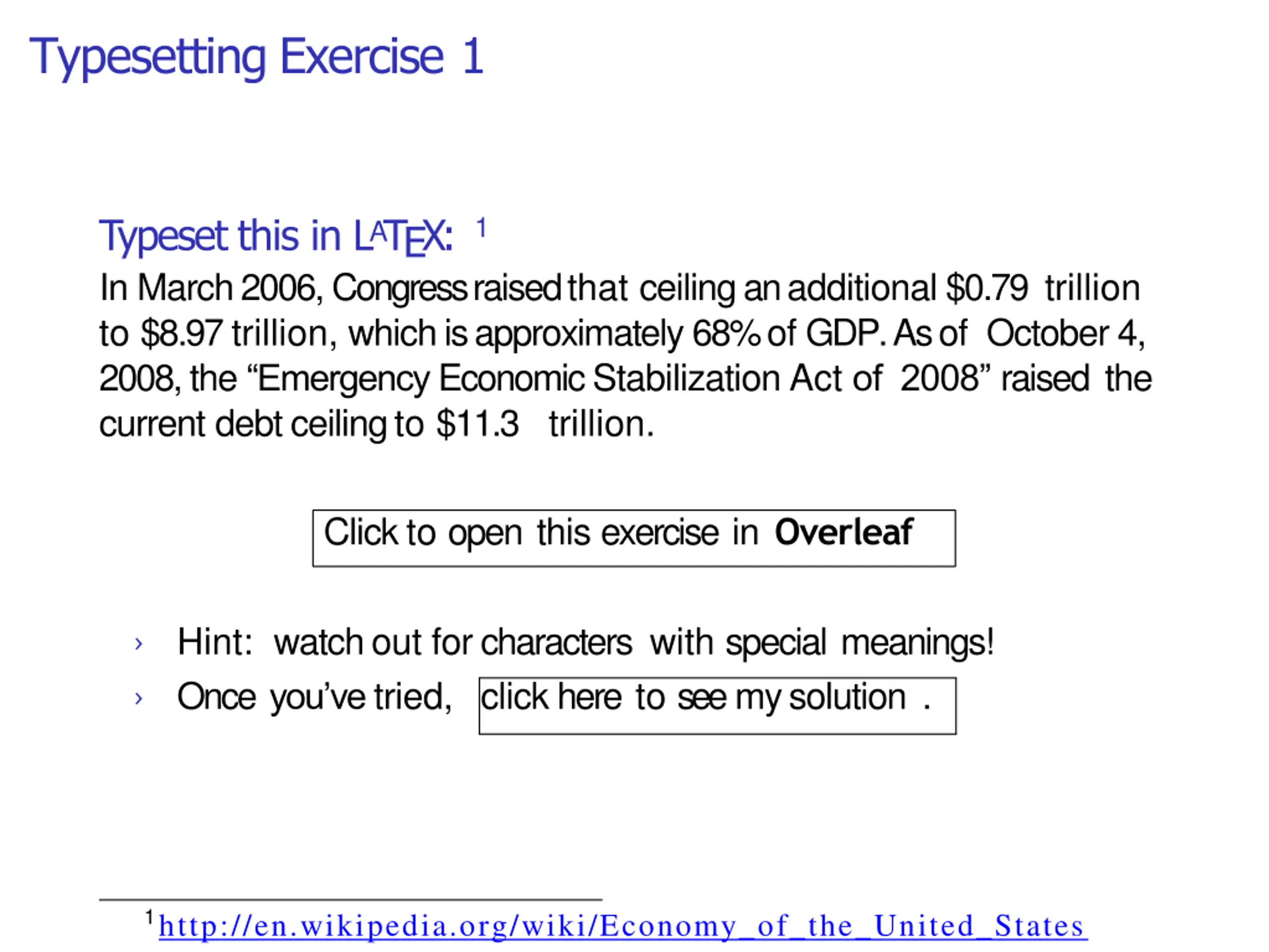 Typesetting Exercise 1 Typeset this in LATEX: 1 In March 2006, Congress raised that ceiling an additional $0.79 trillion to $8.97 trillion, which is approximately 68% of GDP. As of October 4, 2008, the Emergency Economic Stabilization Act of 2008 raised the current debt ceiling to $11.3 trillion. Click to open this exercise in Overleaf Hint: watch out for characters with special meanings! Once you ve tried, click here to see my solution . 1http://en.wikipedia.org/wiki/Economy_of_the_United_States