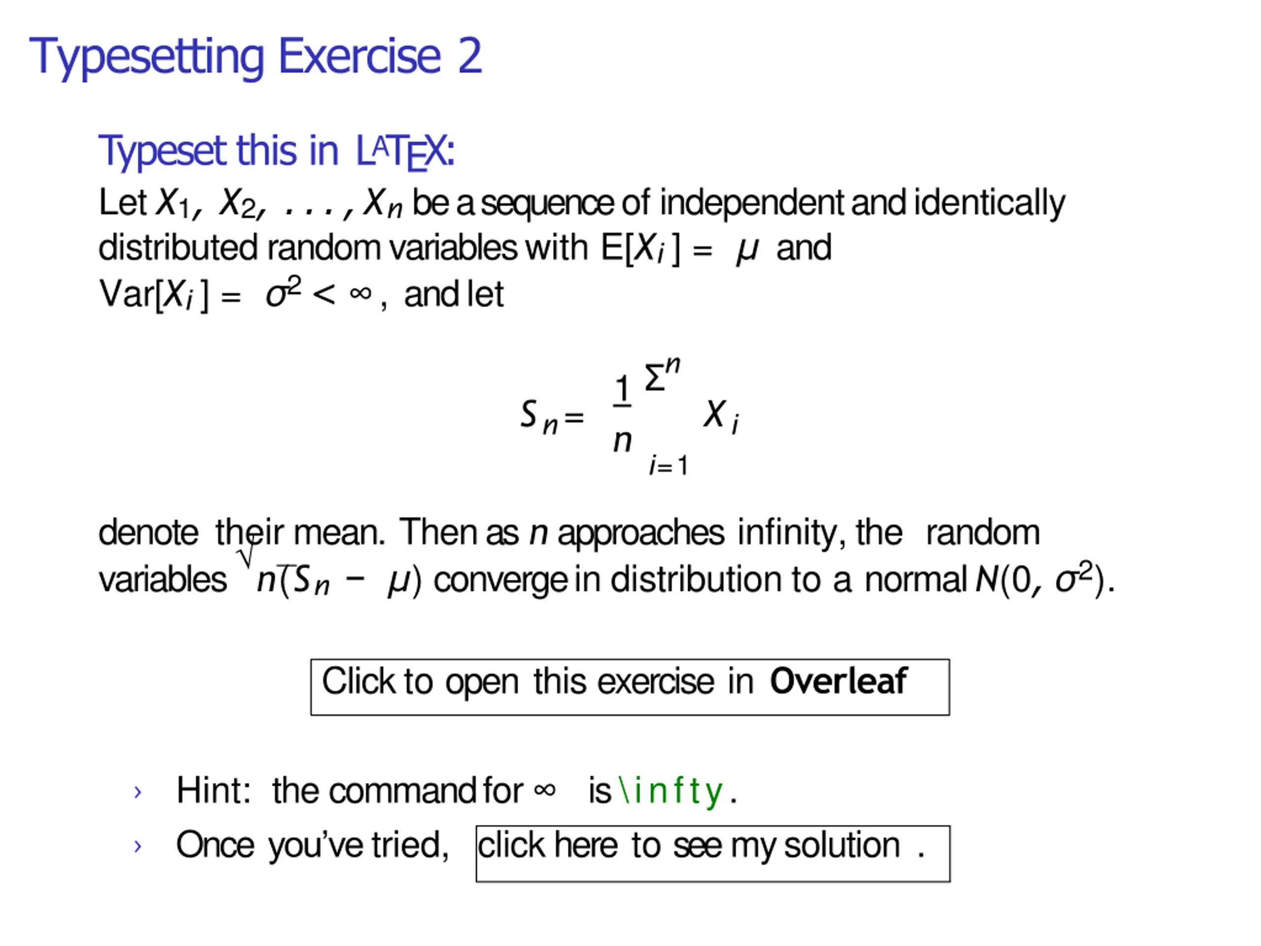 Typesetting Exercise 2 Typeset this in LATEX: Let X1, X2, . . . , Xn be a sequence of independent and identically distributed random variables with E[Xi ] = and Var[Xi ] = 2 < , and let n 1 n S = Xi n i=1 denote their mean. Then as n approaches infinity, the random variables n(Sn ) converge in distribution to a normal N(0, 2). Click to open this exercise in Overleaf Hint: the command for is\infty. Once you ve tried, click here to see my solution .
