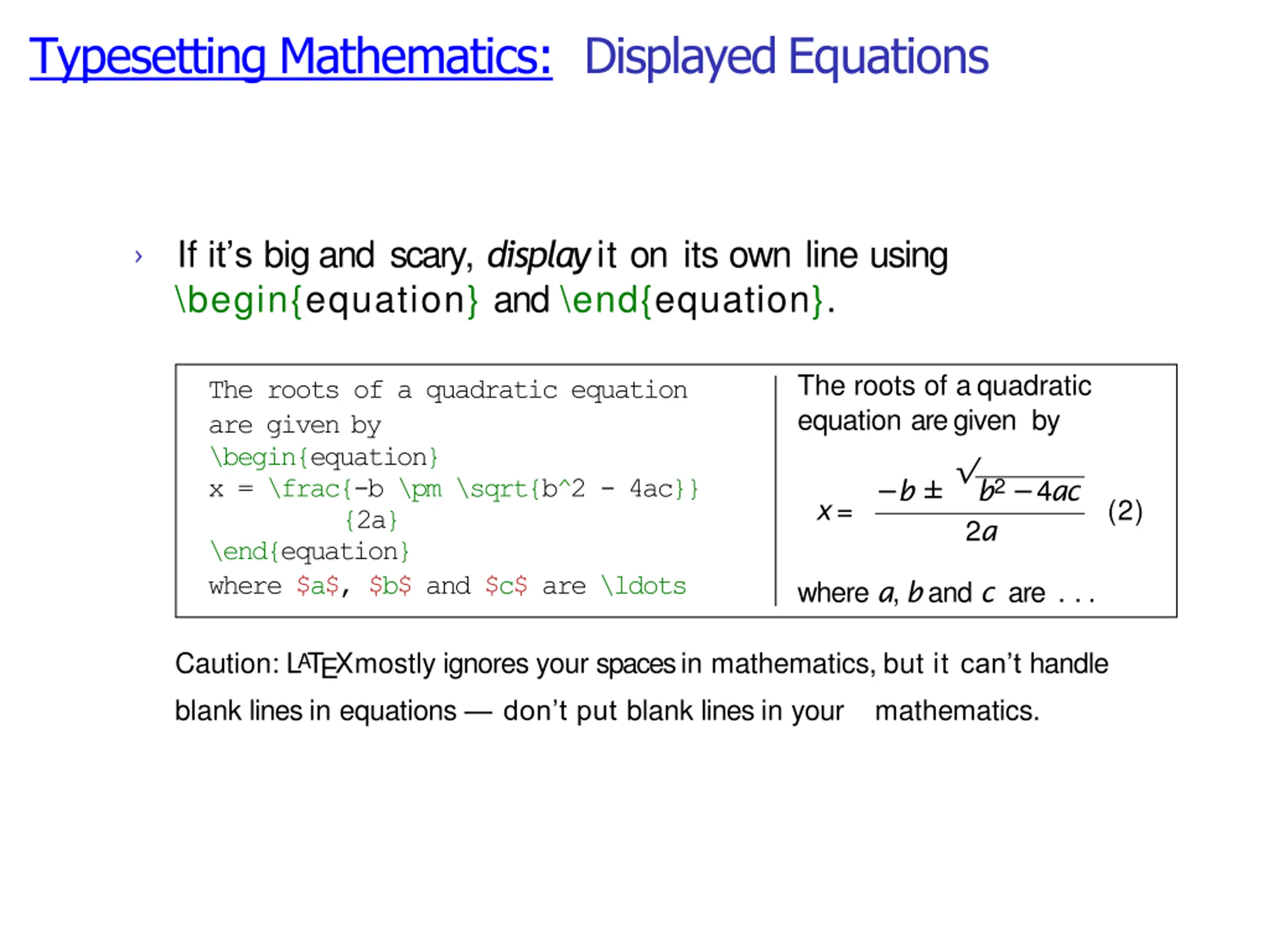 Typesetting Mathematics: DisplayedEquations If it s big and scary, display it on its own line using \begin{equation} and \end{equation}. The roots of a quadratic equation are given by The roots of a quadratic equation are given by \begin{equation} x = \frac{-b \pm \sqrt{b^2 - 4ac}} {2a} \end{equation} where $a$, $b$ and $c$ are \ldots b b2 4ac 2a x = (2) where a, b and c are . . . Caution: LATEX mostly ignores your spaces in mathematics, but it can t handle blank lines in equations don t put blank lines in your mathematics.