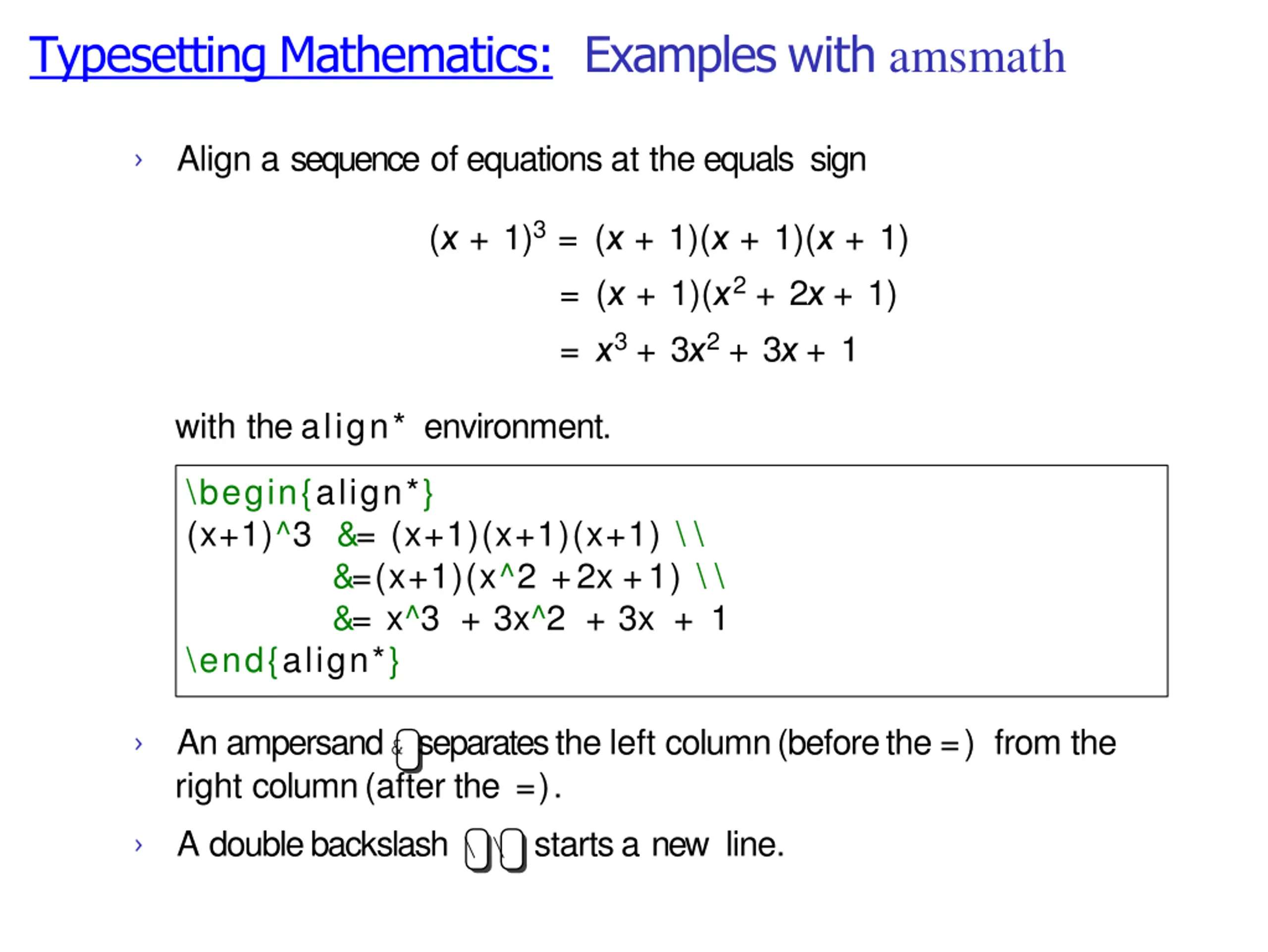 Typesetting Mathematics: Examples with amsmath Align a sequence of equations at the equals sign (x + 1)3= (x + 1)(x + 1)(x + 1) = (x + 1)(x2+ 2x + 1) = x3+ 3x2+ 3x + 1 with the align* environment. \begin{align*} (x+1)^3 &= (x+1)(x+1)(x+1) \ \ &= (x+1)(x^2 + 2x + 1) \ \ &= x^3 + 3x^2 + 3x + 1 \end{align*} An ampersand & separates the left column (before the =) from the right column (after the =). A double backslash \ \ starts a new line.