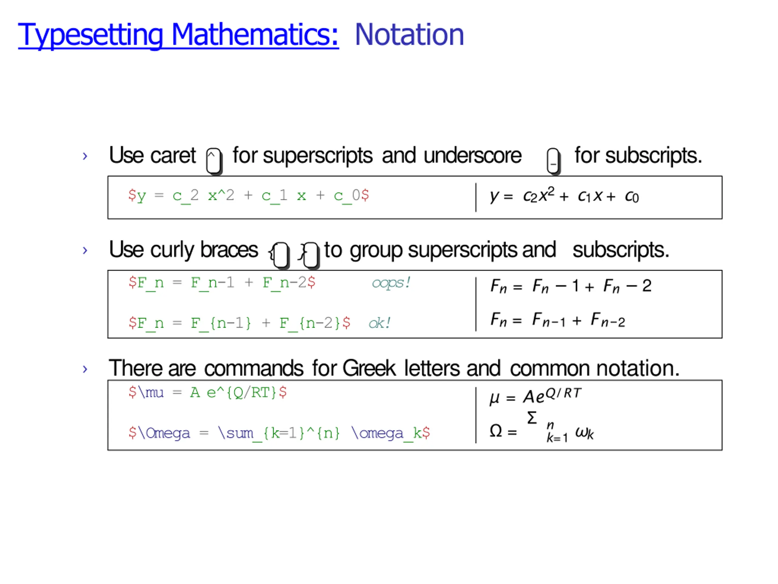 Typesetting Mathematics: Notation Use caret ^ for superscripts and underscore for subscripts. y = c2x2+ c1x + c0 $y = c_2 x^2 + c_1 x + c_0$ Use curly braces { } to group superscripts and subscripts. $F_n = F_n-1 + F_n-2$ oops! Fn = Fn 1 + Fn 2 Fn = Fn 1+ Fn 2 $F_n = F_{n-1} + F_{n-2}$ ok! There are commands for Greek letters and common notation. $\mu = A e^{Q/RT}$ = AeQ/RT n = k $\Omega = \sum_{k=1}^{n} \omega_k$ k=1