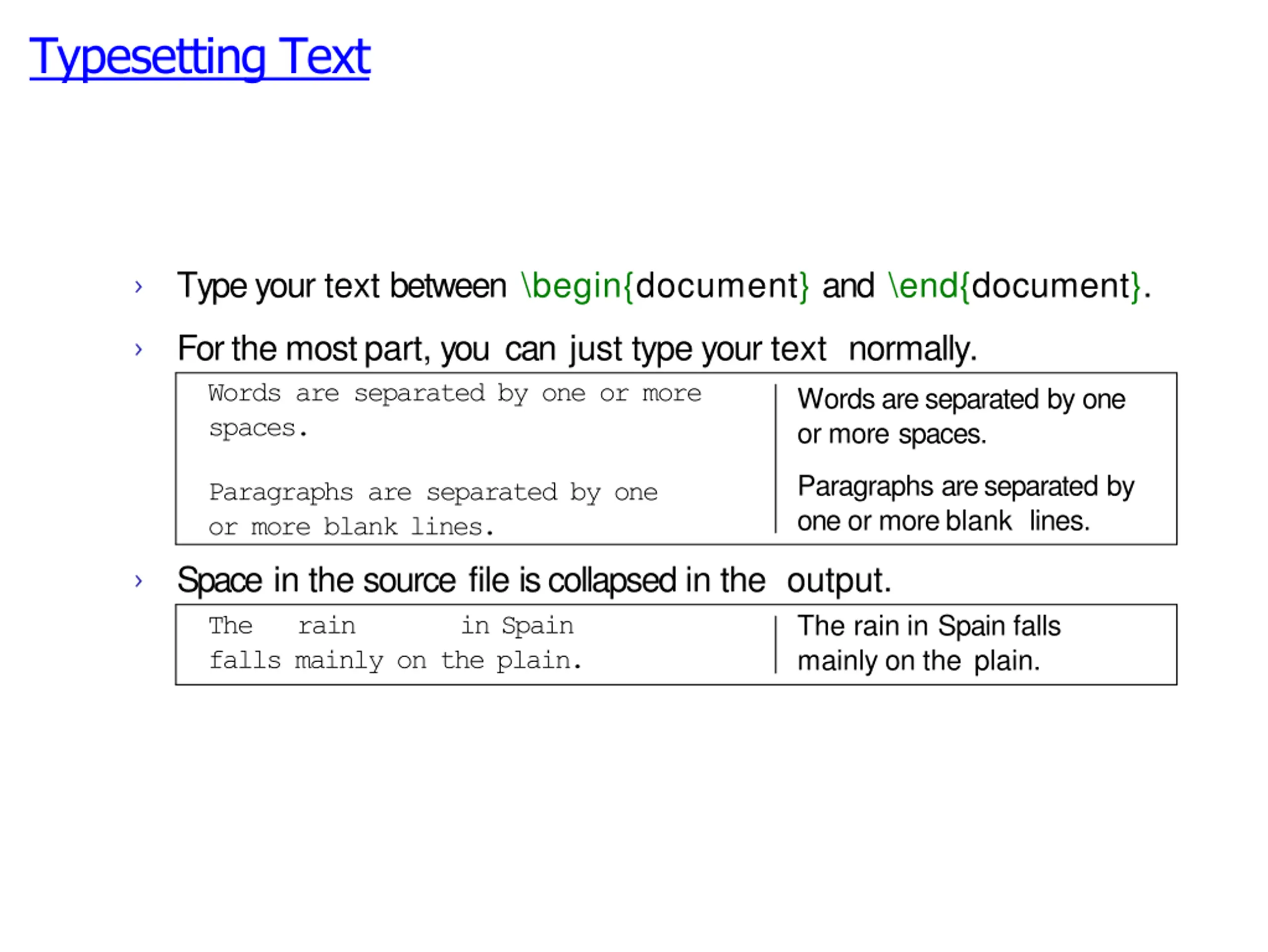Typesetting Text Type your text between \begin{document} and \end{document}. For the most part, you can just type your text normally. Words are separated by one or more spaces. Words are separated by one or more spaces. Paragraphs are separated by one or more blank lines. Paragraphs are separated by one or more blank lines. Space in the source file is collapsed in the output. The rain in Spain falls mainly on the plain. The rain in Spain falls mainly on the plain.