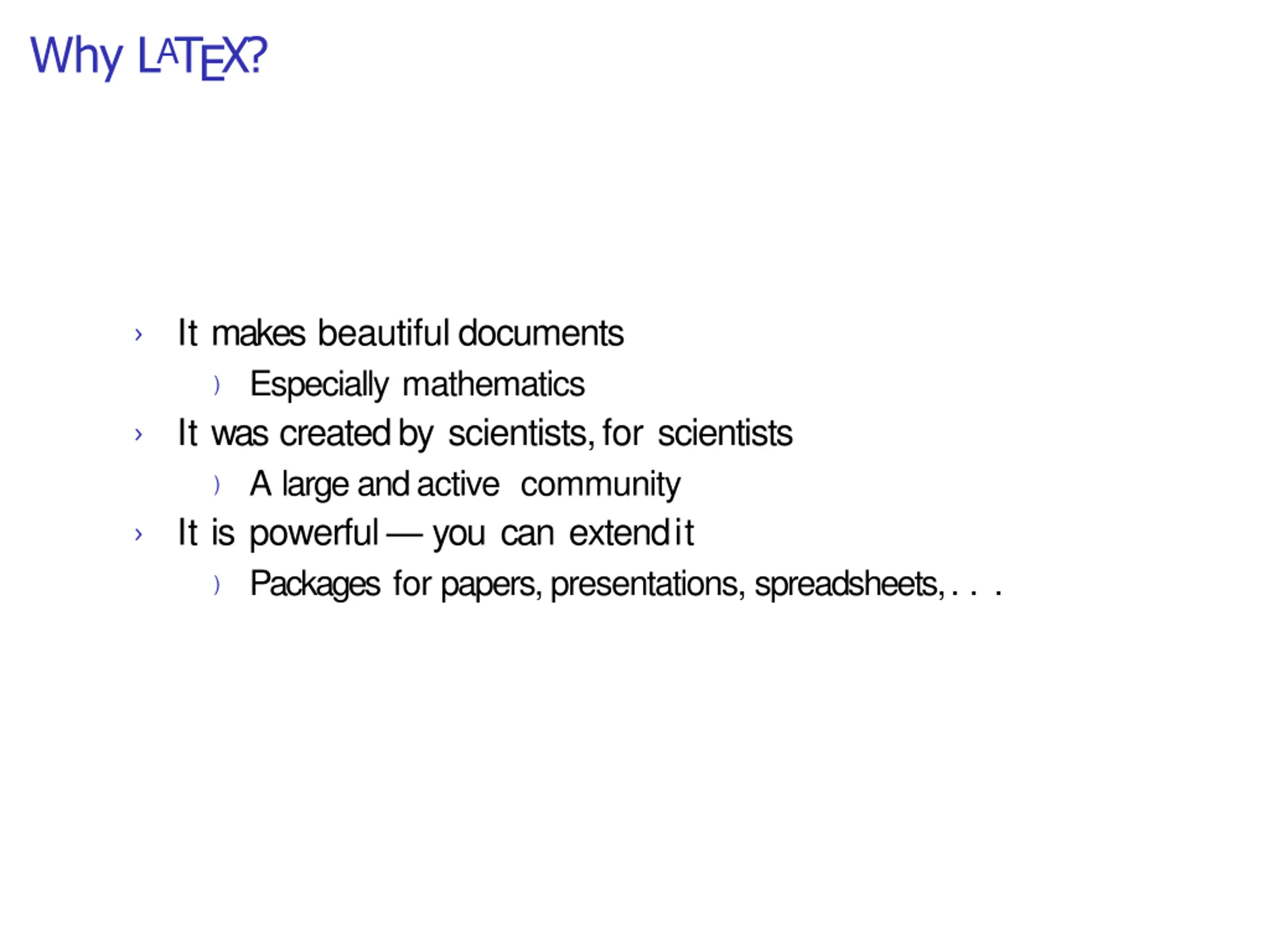Why LATEX? It makes beautiful documents ) Especially mathematics It was created by scientists, for scientists ) A large and active community It is powerful you can extendit ) Packages for papers, presentations, spreadsheets, . . .