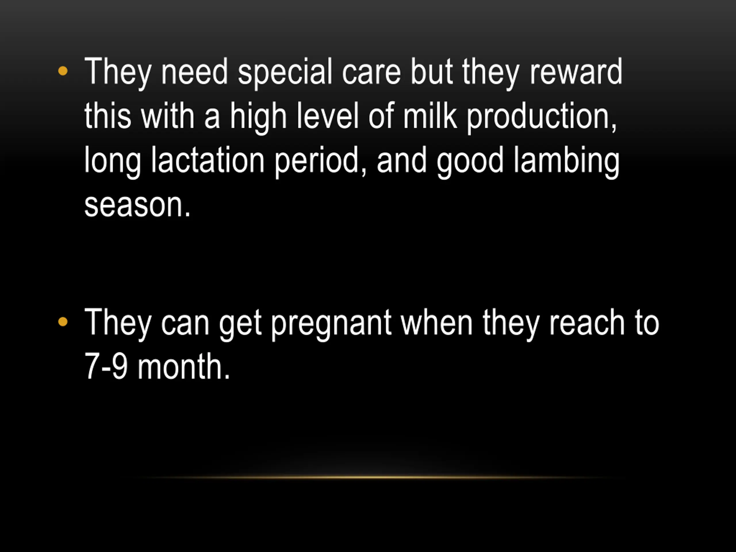 They need special care but they reward this with a high level of milk production, long lactation period, and good lambing season. They can get pregnant when they reach to 7-9 month.