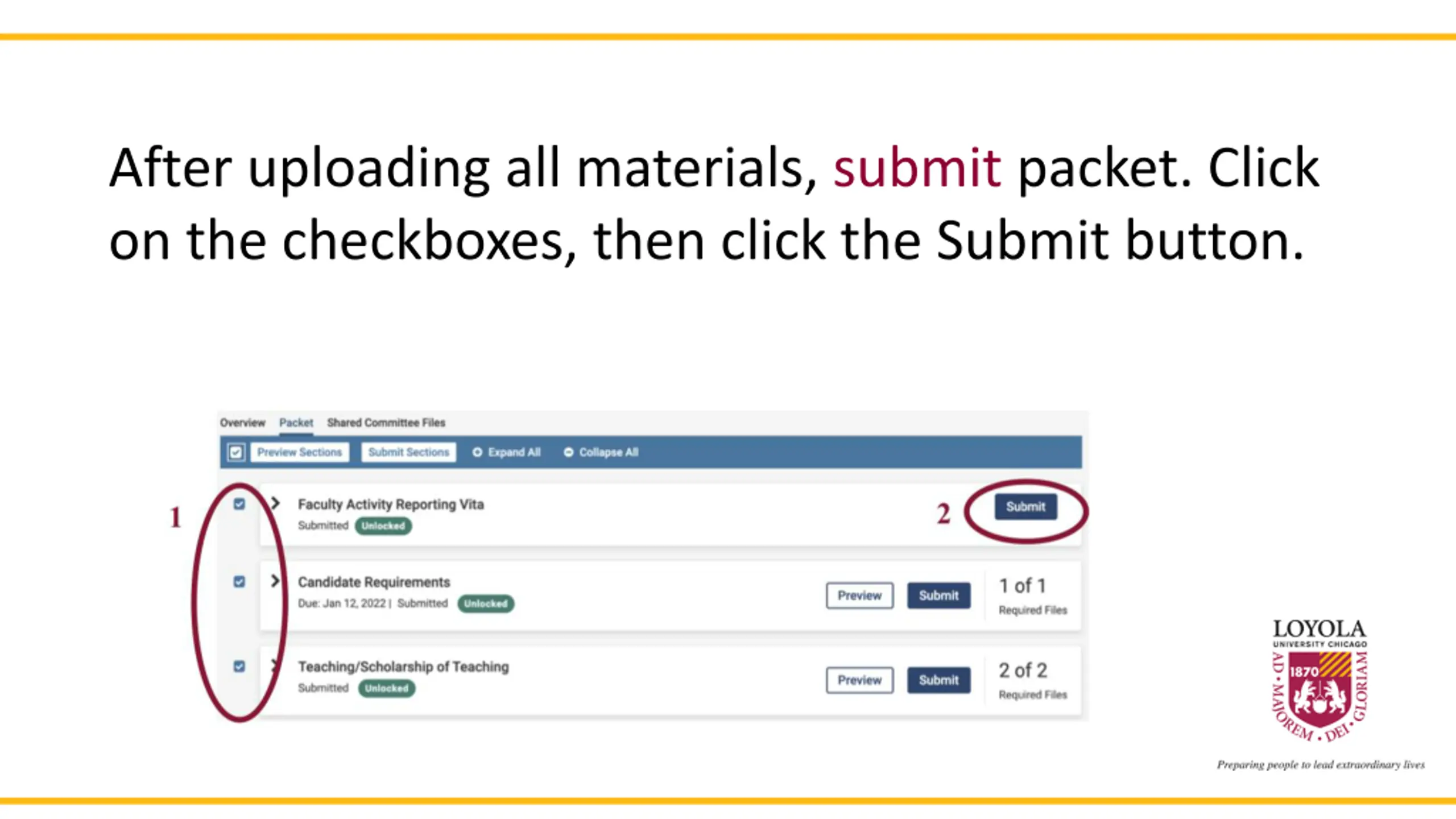 After uploading all materials, submit packet. Click on the checkboxes, then click the Submit button.