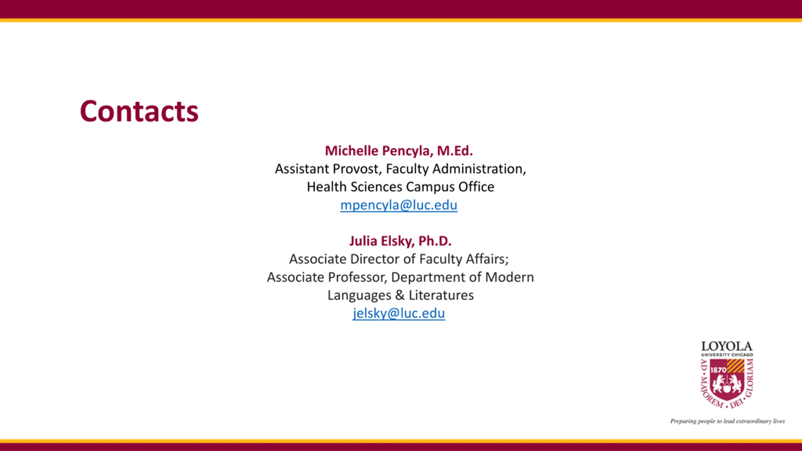 Contacts Michelle Pencyla, M.Ed. Assistant Provost, Faculty Administration, Health Sciences Campus Office mpencyla@luc.edu Julia Elsky, Ph.D. Associate Director of Faculty Affairs; Associate Professor, Department of Modern Languages & Literatures jelsky@luc.edu
