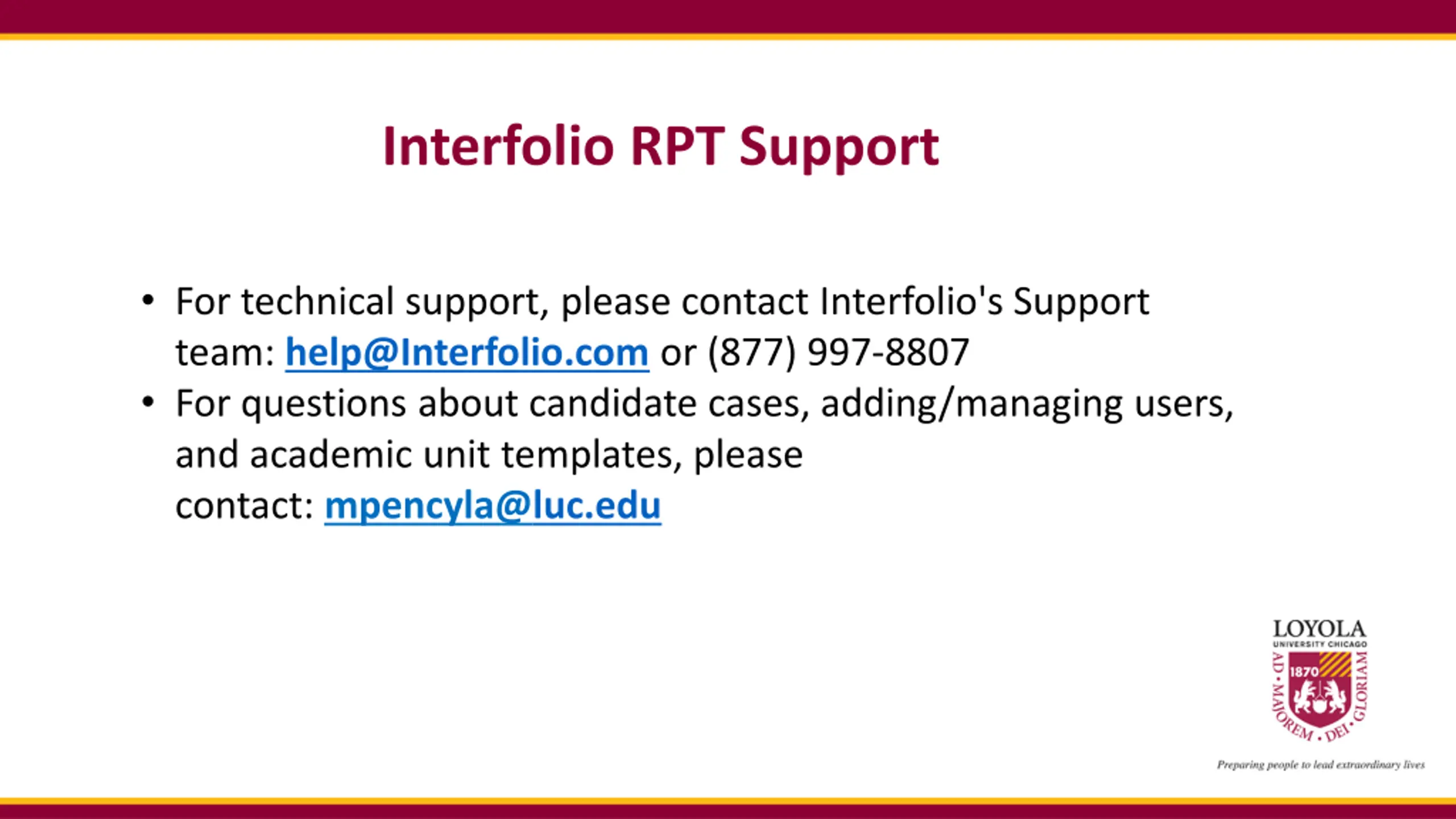 Interfolio RPT Support For technical support, please contact Interfolio's Support team: help@Interfolio.com or (877) 997-8807 For questions about candidate cases, adding/managing users, and academic unit templates, please contact: mpencyla@luc.edu