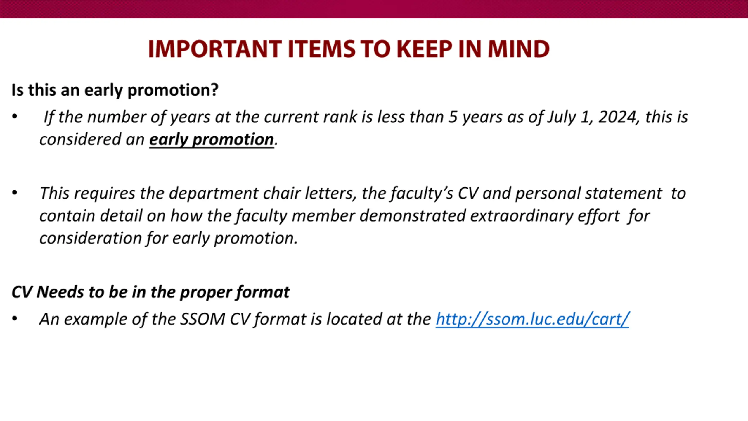 Is this an early promotion? If the number of years at the current rank is less than 5 years as of July 1, 2024, this is considered an early promotion. This requires the department chair letters, the faculty s CV and personal statement to contain detail on how the faculty member demonstrated extraordinary effort for consideration for early promotion. CV Needs to be in the proper format An example of the SSOM CV format is located at the http://ssom.luc.edu/cart/