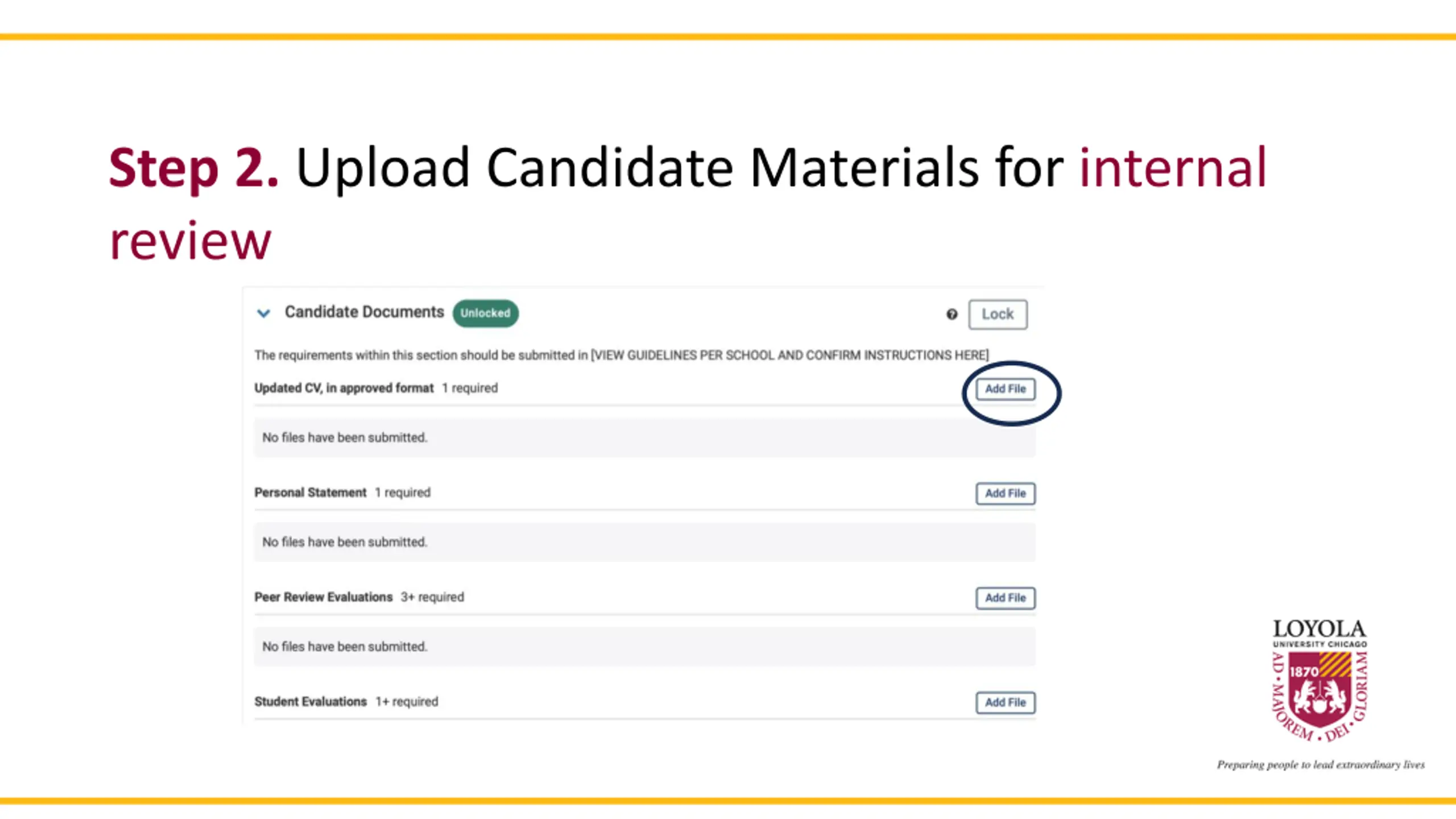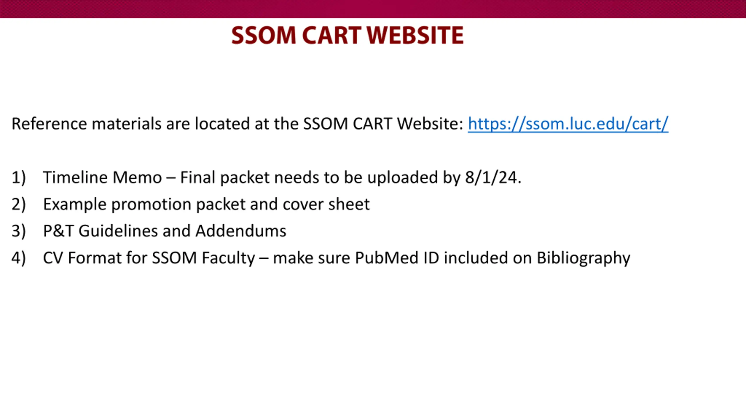 Reference materials are located at the SSOM CART Website: https://ssom.luc.edu/cart/ 1) Timeline Memo Final packet needs to be uploaded by 8/1/24. 2) Example promotion packet and cover sheet 3) P&T Guidelines and Addendums 4) CV Format for SSOM Faculty make sure PubMed ID included on Bibliography