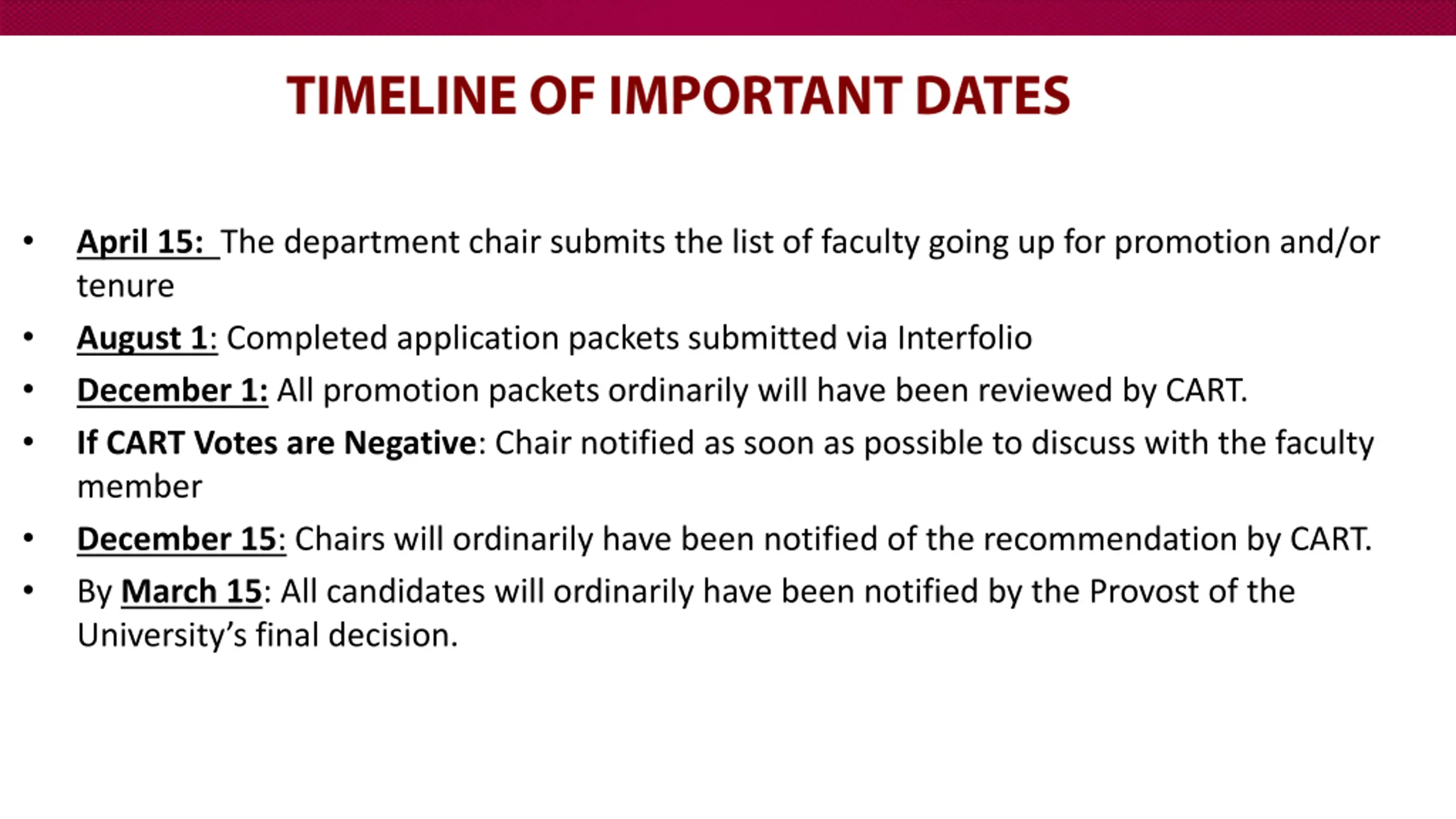 April 15: The department chair submits the list of faculty going up for promotion and/or tenure August 1: Completed application packets submitted via Interfolio December 1: All promotion packets ordinarily will have been reviewed by CART. If CART Votes are Negative: Chair notified as soon as possible to discuss with the faculty member December 15: Chairs will ordinarily have been notified of the recommendation by CART. By March 15: All candidates will ordinarily have been notified by the Provost of the University s final decision.