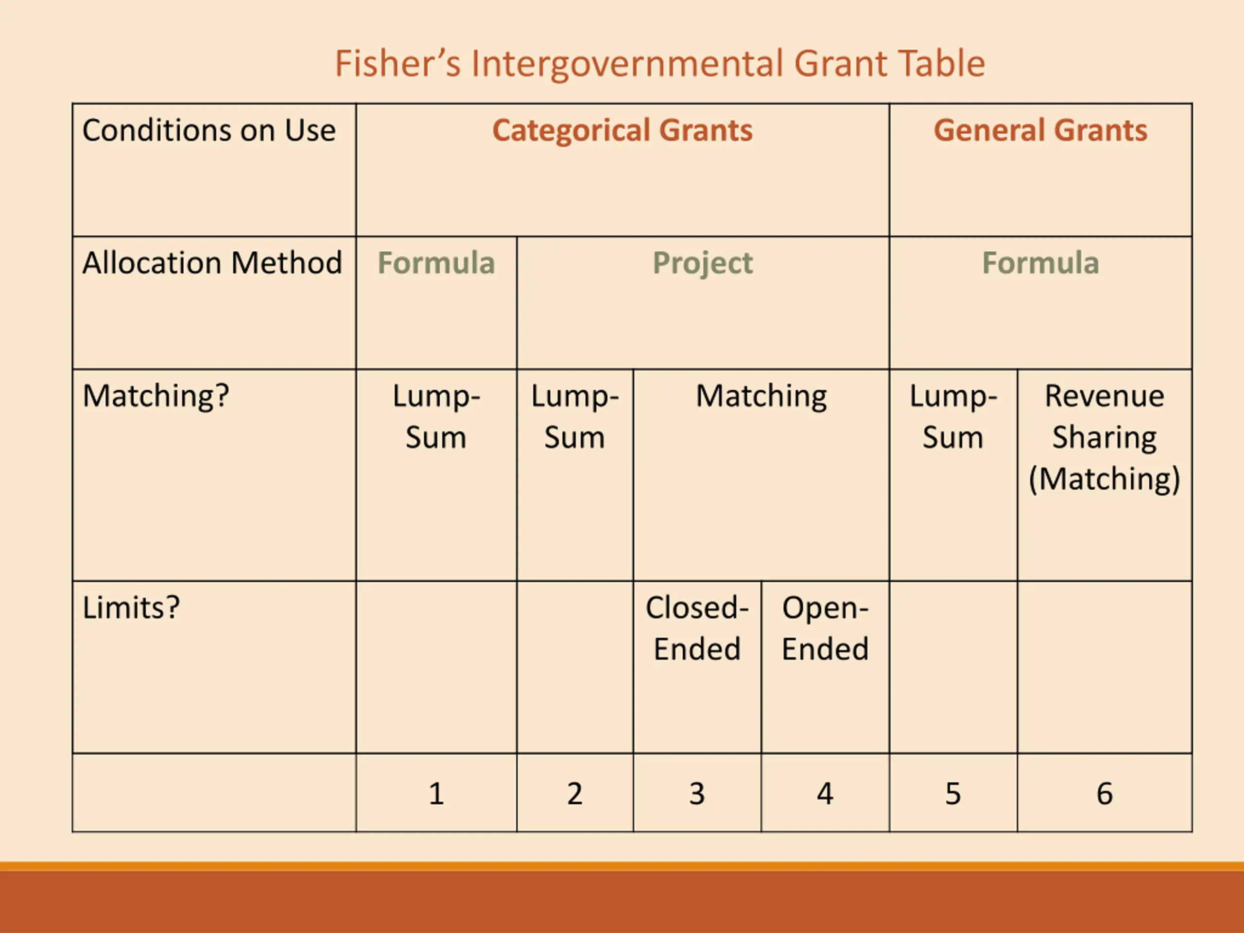 Fishers Intergovernmental Grant Table Conditions on Use Categorical Grants General Grants Allocation Method Formula Project Formula Matching? Lump- Sum Lump- Sum Matching Lump- Sum Revenue Sharing (Matching) Limits? Closed- Ended Open- Ended 1 2 3 4 5 6