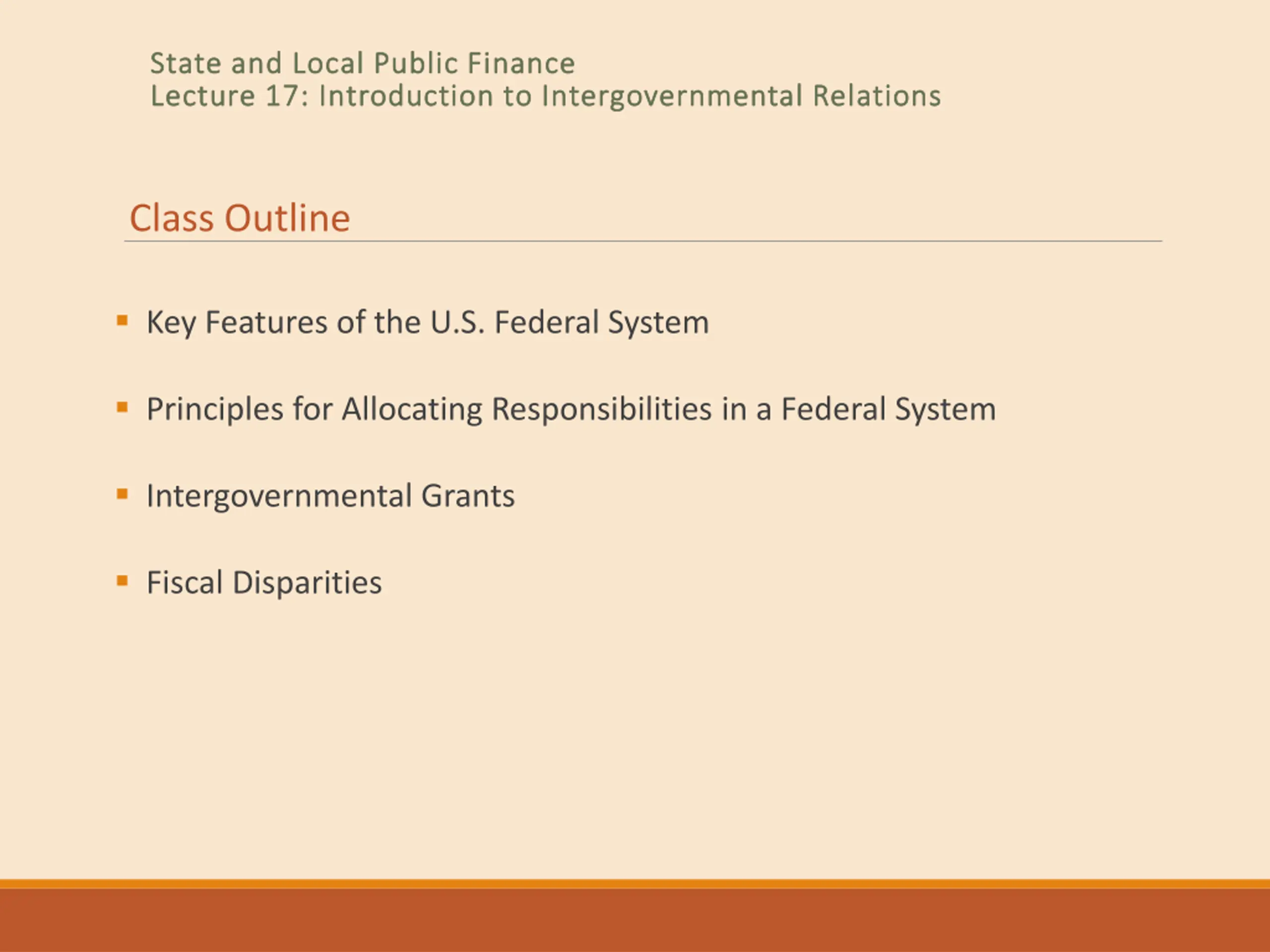 State and Local Public Finance State and Local Public Finance Lecture 17: Introduction to Intergovernmental Relations Lecture 17: Introduction to Intergovernmental Relations Class Outline Key Features of the U.S. Federal System Principles for Allocating Responsibilities in a Federal System Intergovernmental Grants Fiscal Disparities