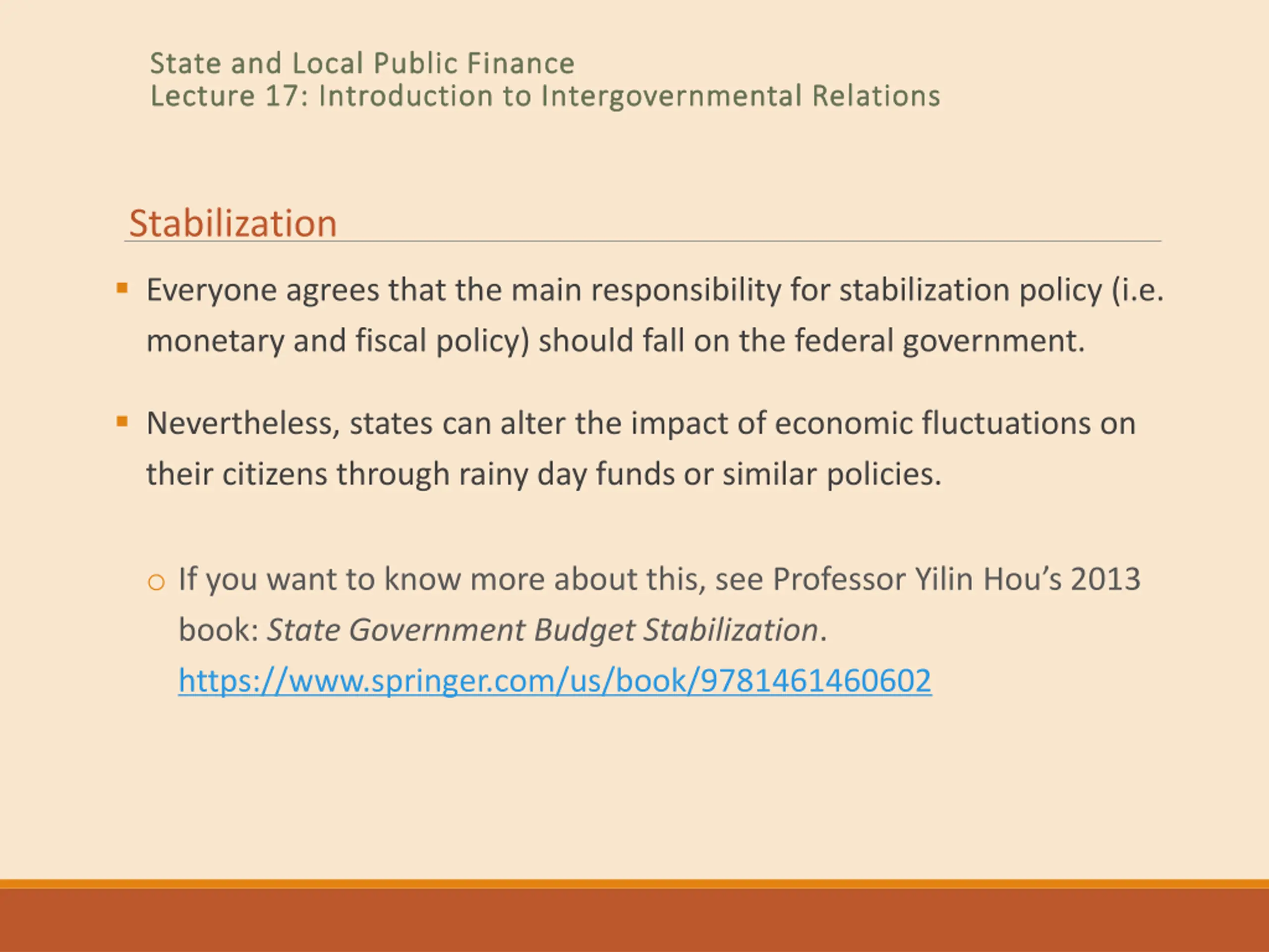 State and Local Public Finance State and Local Public Finance Lecture 17: Introduction to Intergovernmental Relations Lecture 17: Introduction to Intergovernmental Relations Stabilization Everyone agrees that the main responsibility for stabilization policy (i.e. monetary and fiscal policy) should fall on the federal government. Nevertheless, states can alter the impact of economic fluctuations on their citizens through rainy day funds or similar policies. o If you want to know more about this, see Professor Yilin Hou s 2013 book: State Government Budget Stabilization. https://www.springer.com/us/book/9781461460602