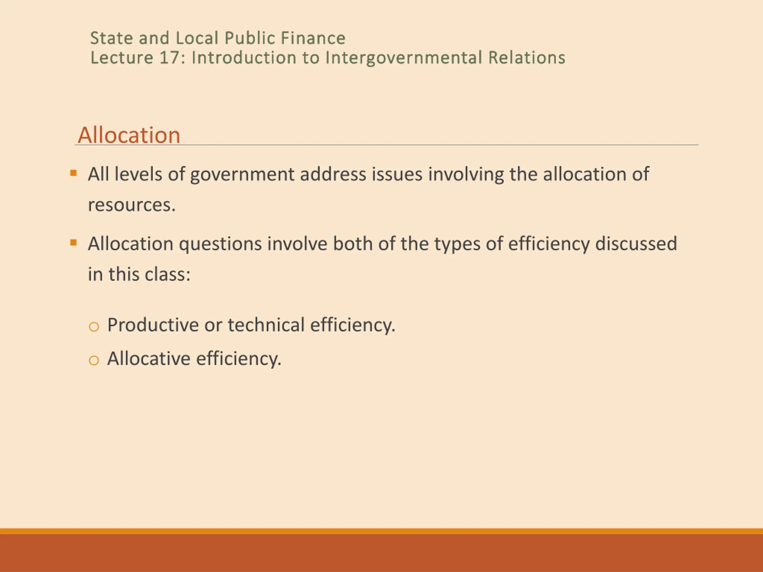 State and Local Public Finance State and Local Public Finance Lecture 17: Introduction to Intergovernmental Relations Lecture 17: Introduction to Intergovernmental Relations Allocation All levels of government address issues involving the allocation of resources. Allocation questions involve both of the types of efficiency discussed in this class: o Productive or technical efficiency. o Allocative efficiency.