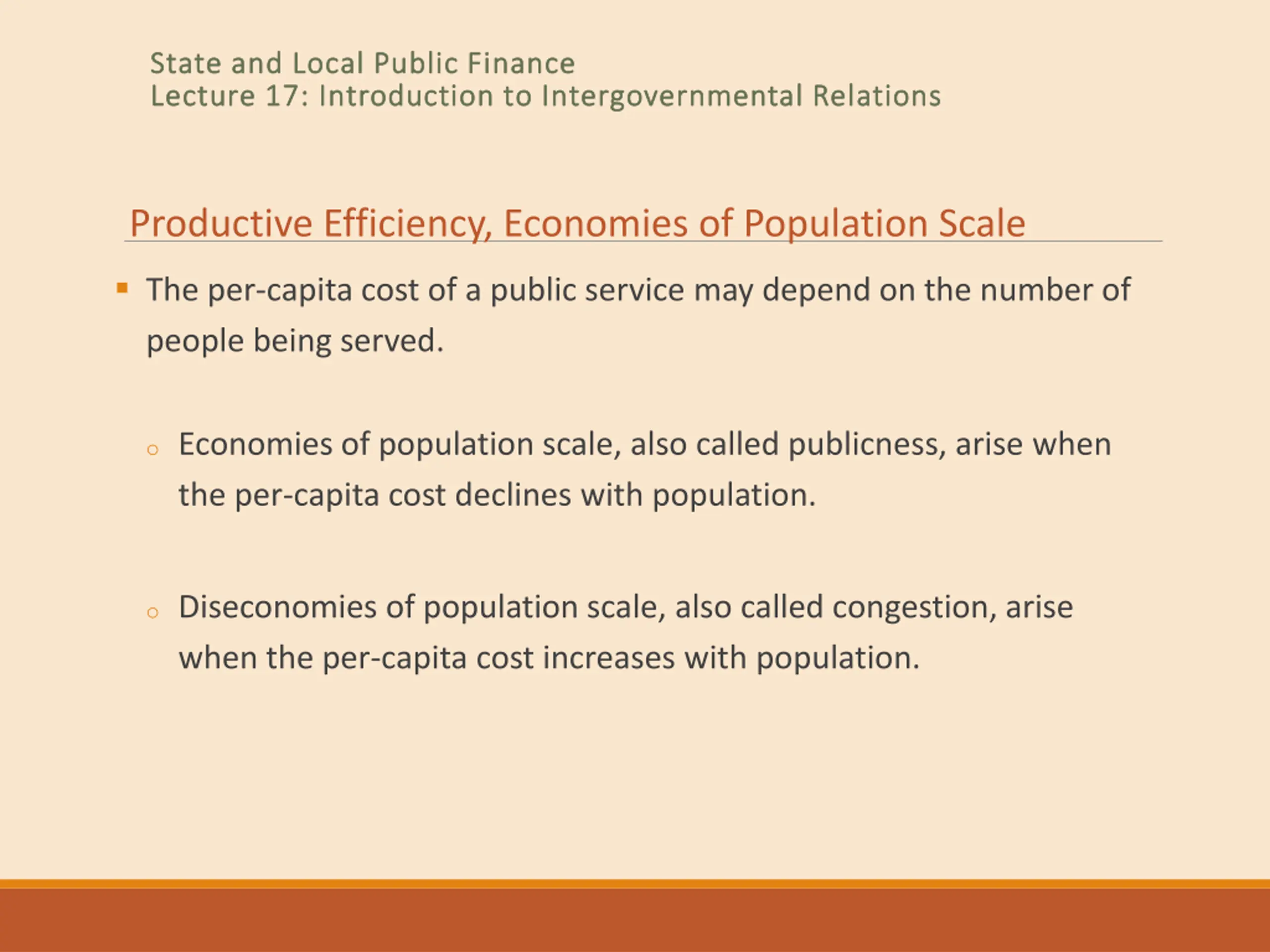 State and Local Public Finance State and Local Public Finance Lecture 17: Introduction to Intergovernmental Relations Lecture 17: Introduction to Intergovernmental Relations Productive Efficiency, Economies of Population Scale The per-capita cost of a public service may depend on the number of people being served. o Economies of population scale, also called publicness, arise when the per-capita cost declines with population. o Diseconomies of population scale, also called congestion, arise when the per-capita cost increases with population.