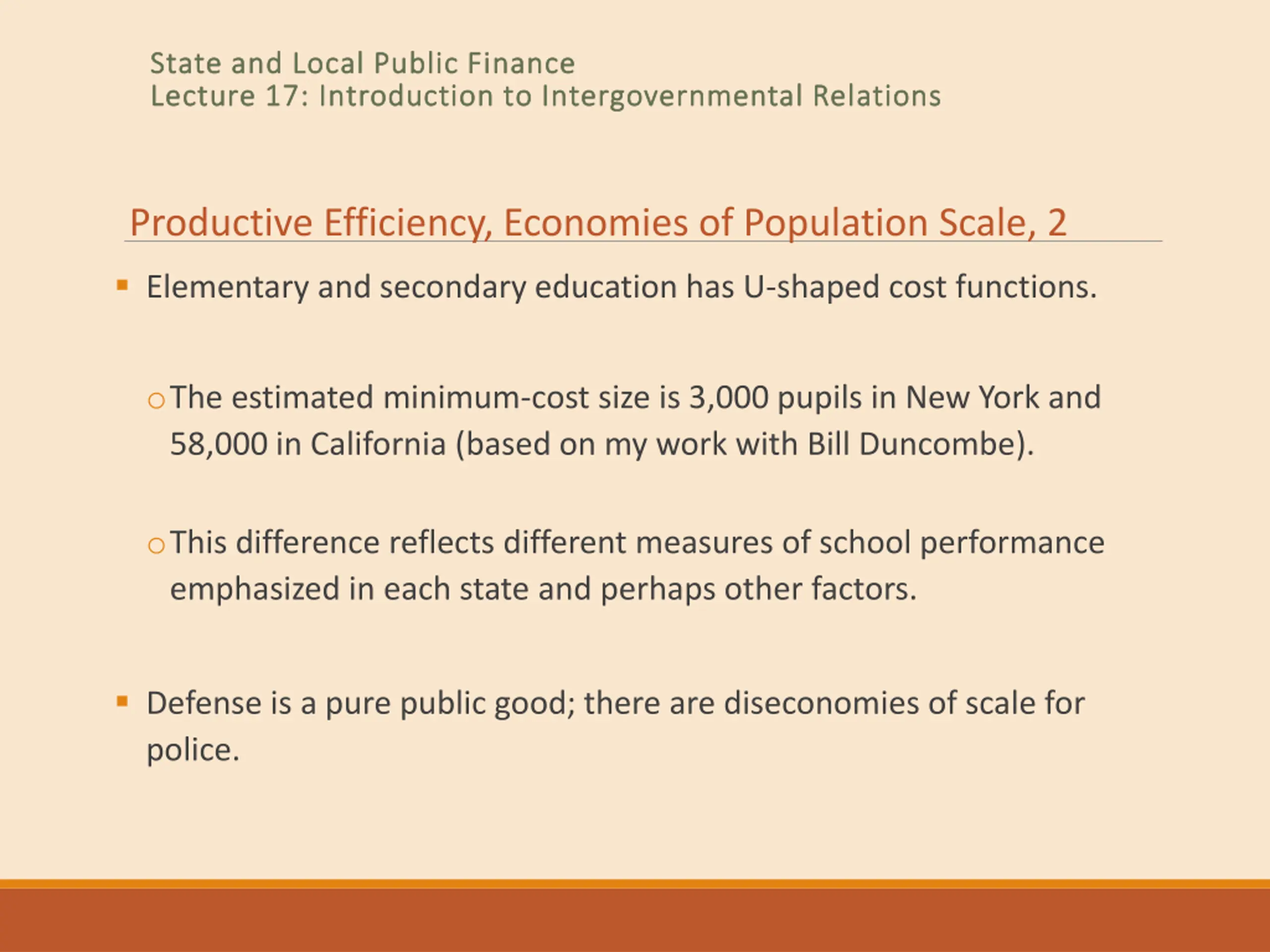 State and Local Public Finance State and Local Public Finance Lecture 17: Introduction to Intergovernmental Relations Lecture 17: Introduction to Intergovernmental Relations Productive Efficiency, Economies of Population Scale, 2 Elementary and secondary education has U-shaped cost functions. oThe estimated minimum-cost size is 3,000 pupils in New York and 58,000 in California (based on my work with Bill Duncombe). oThis difference reflects different measures of school performance emphasized in each state and perhaps other factors. Defense is a pure public good; there are diseconomies of scale for police.