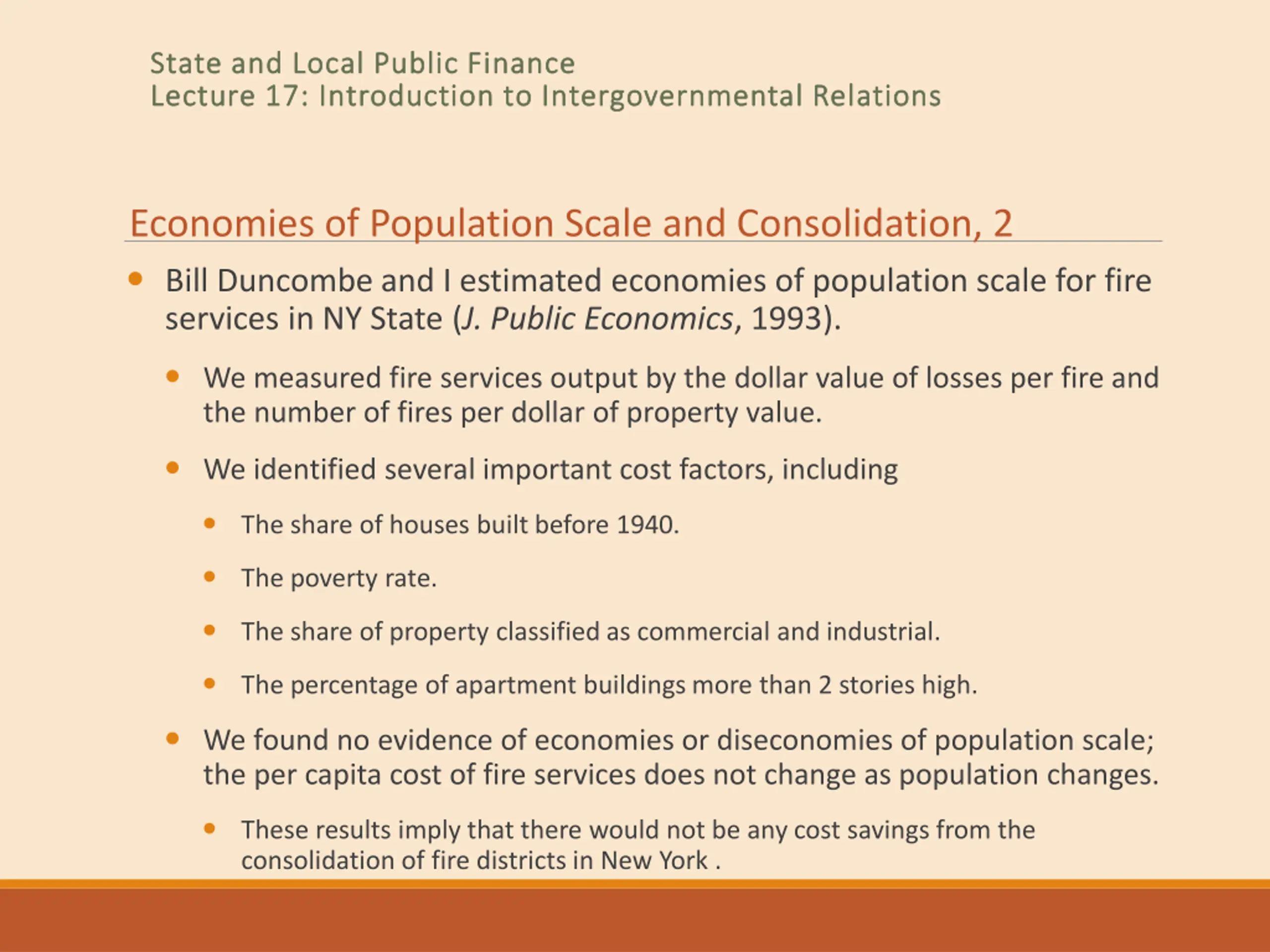 State and Local Public Finance State and Local Public Finance Lecture 17: Introduction to Intergovernmental Relations Lecture 17: Introduction to Intergovernmental Relations Economies of Population Scale and Consolidation, 2 Bill Duncombe and I estimated economies of population scale for fire services in NY State (J. Public Economics, 1993). We measured fire services output by the dollar value of losses per fire and the number of fires per dollar of property value. We identified several important cost factors, including The share of houses built before 1940. The poverty rate. The share of property classified as commercial and industrial. The percentage of apartment buildings more than 2 stories high. We found no evidence of economies or diseconomies of population scale; the per capita cost of fire services does not change as population changes. These results imply that there would not be any cost savings from the consolidation of fire districts in New York .