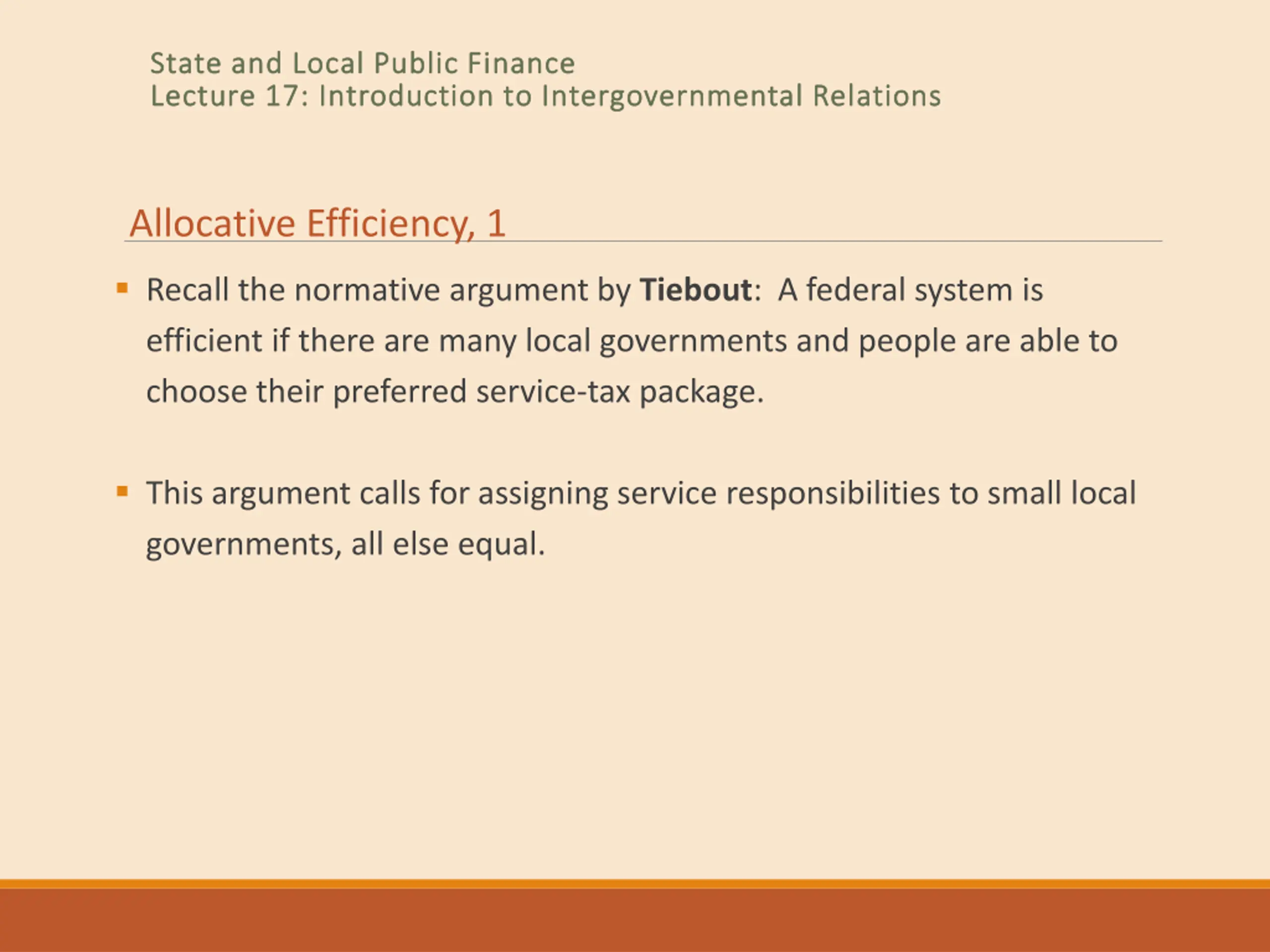 State and Local Public Finance State and Local Public Finance Lecture 17: Introduction to Intergovernmental Relations Lecture 17: Introduction to Intergovernmental Relations Allocative Efficiency, 1 Recall the normative argument by Tiebout: A federal system is efficient if there are many local governments and people are able to choose their preferred service-tax package. This argument calls for assigning service responsibilities to small local governments, all else equal.