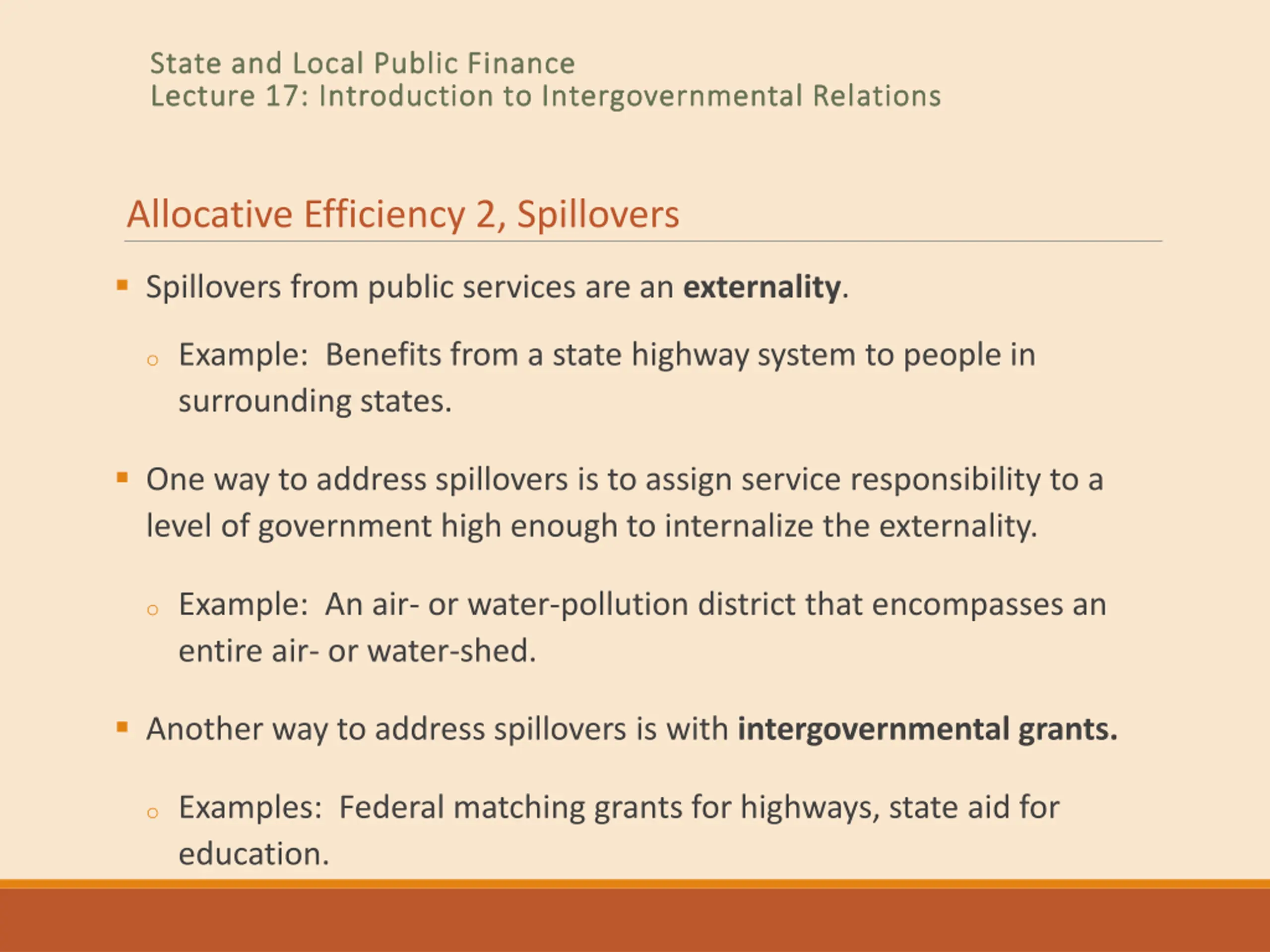 State and Local Public Finance State and Local Public Finance Lecture 17: Introduction to Intergovernmental Relations Lecture 17: Introduction to Intergovernmental Relations Allocative Efficiency 2, Spillovers Spillovers from public services are an externality. o Example: Benefits from a state highway system to people in surrounding states. One way to address spillovers is to assign service responsibility to a level of government high enough to internalize the externality. o Example: An air- or water-pollution district that encompasses an entire air- or water-shed. Another way to address spillovers is with intergovernmental grants. o Examples: Federal matching grants for highways, state aid for education.