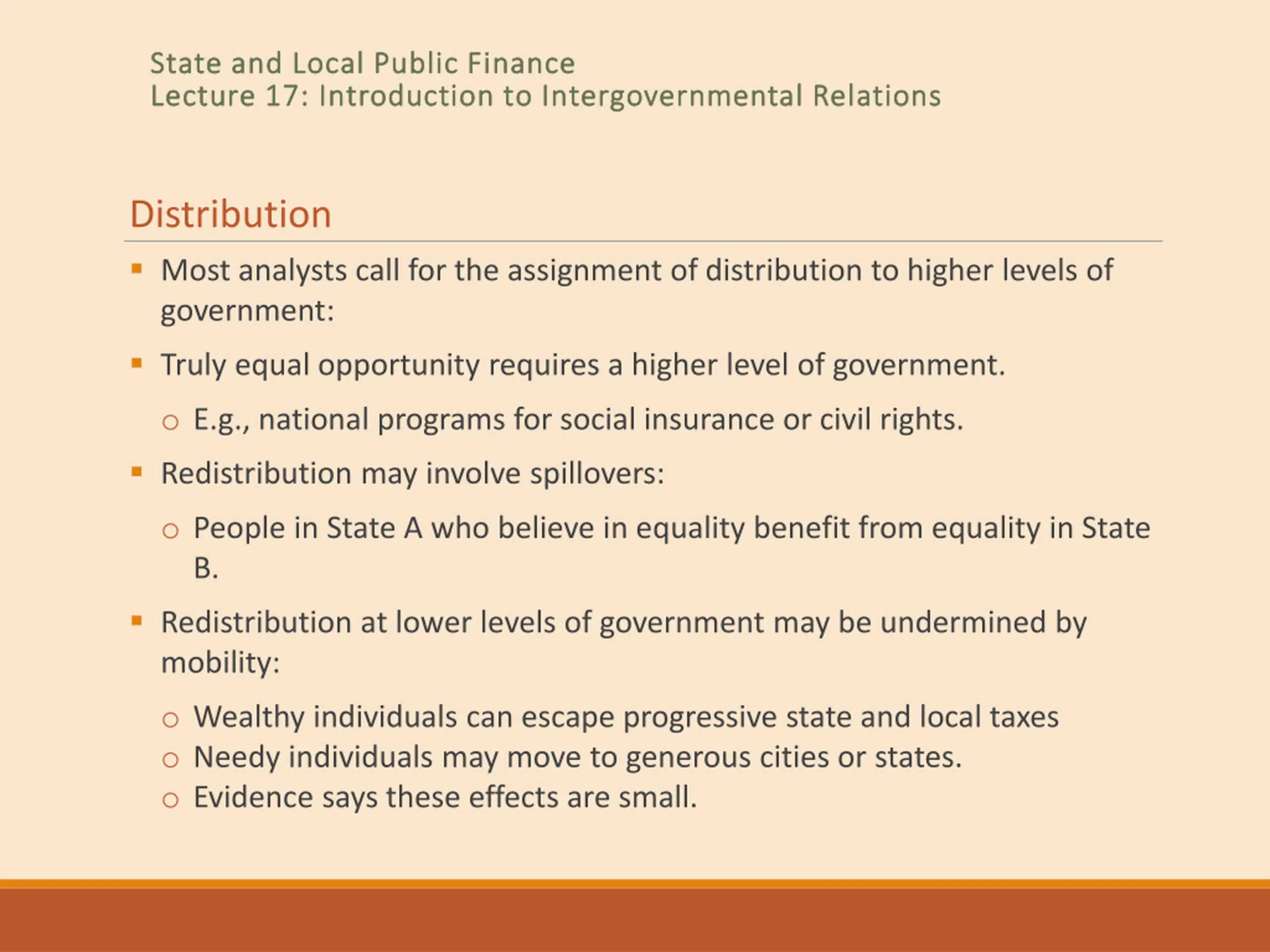 State and Local Public Finance State and Local Public Finance Lecture 17: Introduction to Intergovernmental Relations Lecture 17: Introduction to Intergovernmental Relations Distribution Most analysts call for the assignment of distribution to higher levels of government: Truly equal opportunity requires a higher level of government. o E.g., national programs for social insurance or civil rights. Redistribution may involve spillovers: o People in State A who believe in equality benefit from equality in State B. Redistribution at lower levels of government may be undermined by mobility: o Wealthy individuals can escape progressive state and local taxes o Needy individuals may move to generous cities or states. o Evidence says these effects are small.