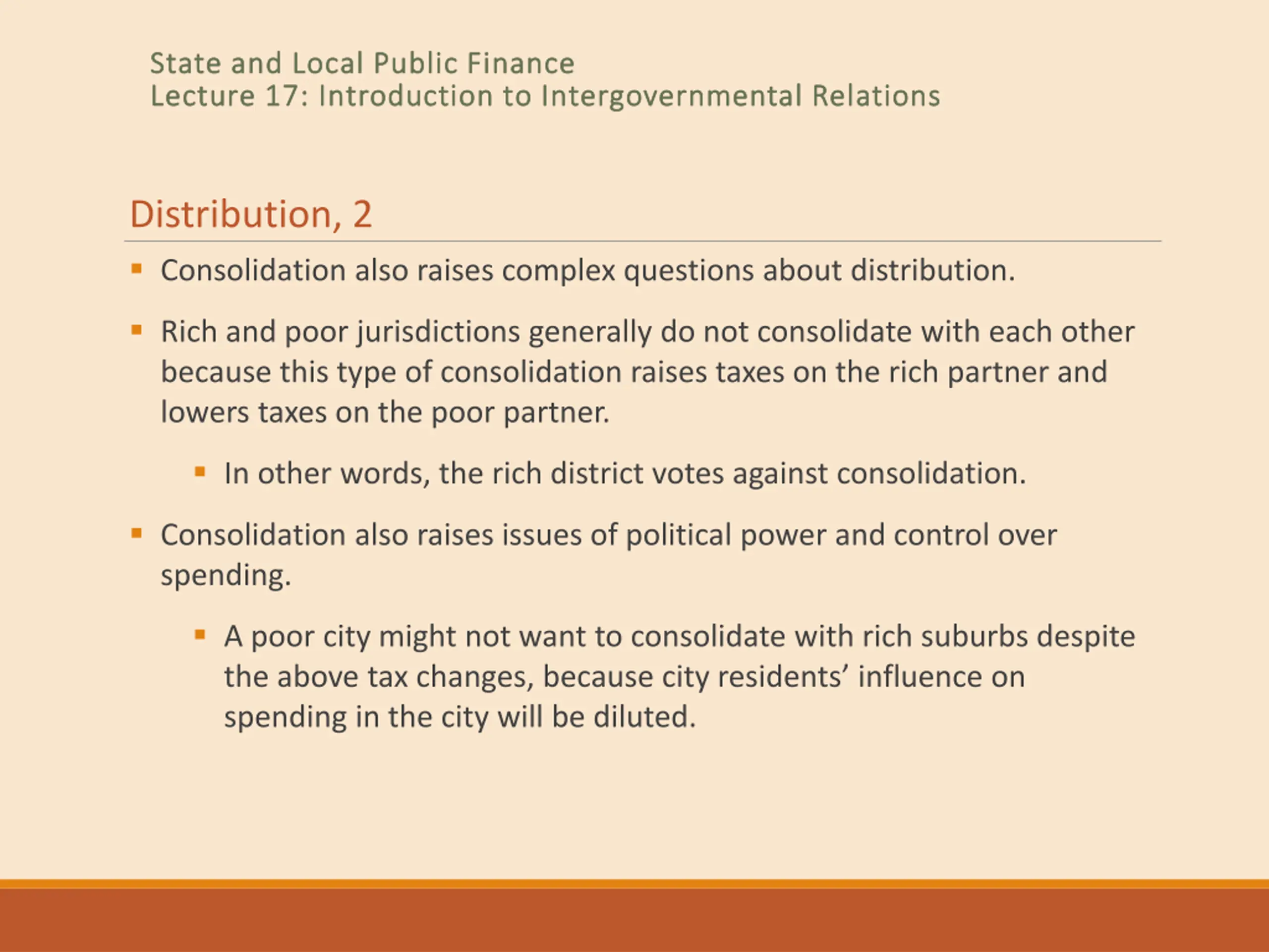 State and Local Public Finance State and Local Public Finance Lecture 17: Introduction to Intergovernmental Relations Lecture 17: Introduction to Intergovernmental Relations Distribution, 2 Consolidation also raises complex questions about distribution. Rich and poor jurisdictions generally do not consolidate with each other because this type of consolidation raises taxes on the rich partner and lowers taxes on the poor partner. In other words, the rich district votes against consolidation. Consolidation also raises issues of political power and control over spending. A poor city might not want to consolidate with rich suburbs despite the above tax changes, because city residents influence on spending in the city will be diluted.