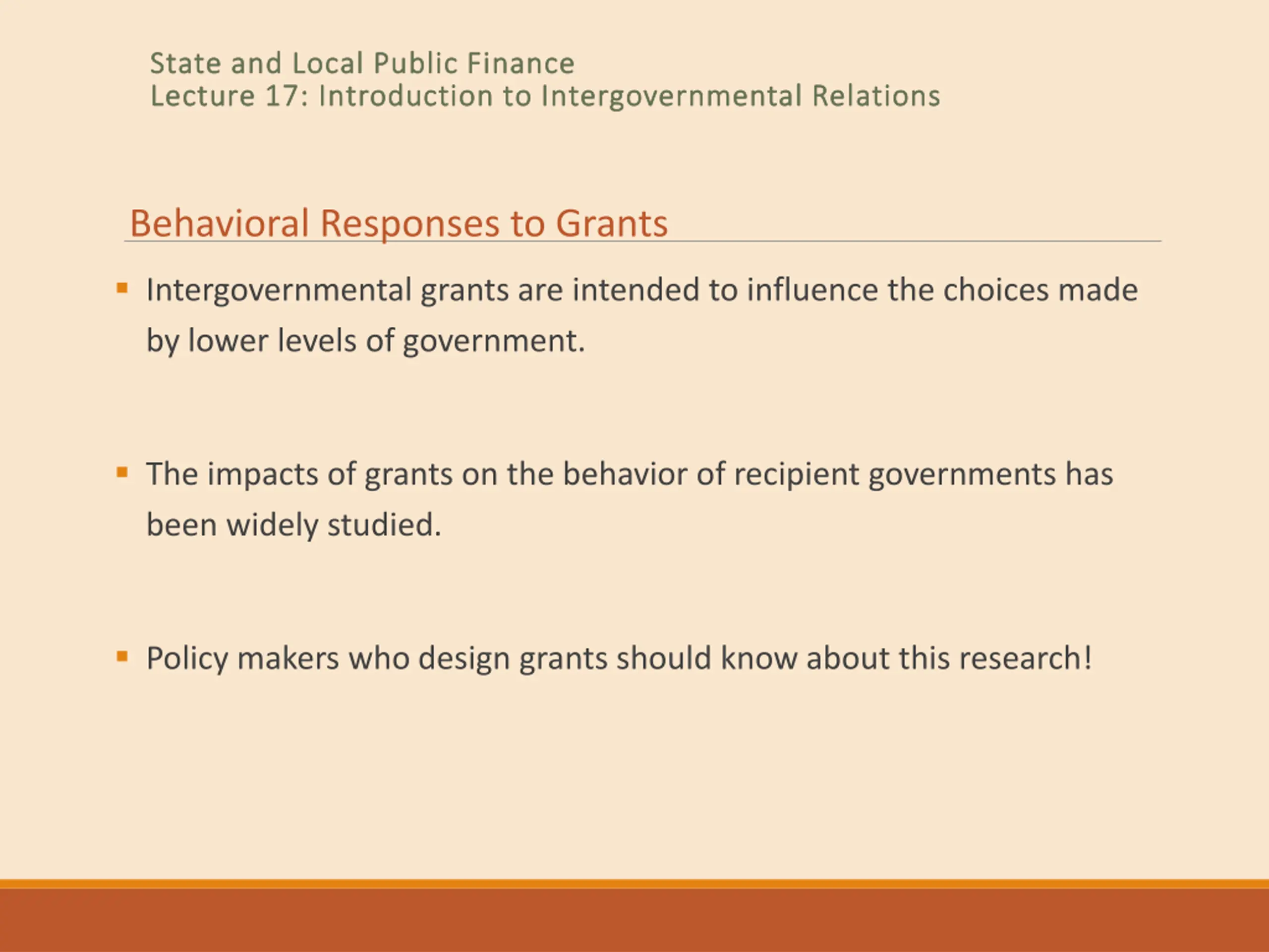 State and Local Public Finance State and Local Public Finance Lecture 17: Introduction to Intergovernmental Relations Lecture 17: Introduction to Intergovernmental Relations Behavioral Responses to Grants Intergovernmental grants are intended to influence the choices made by lower levels of government. The impacts of grants on the behavior of recipient governments has been widely studied. Policy makers who design grants should know about this research!