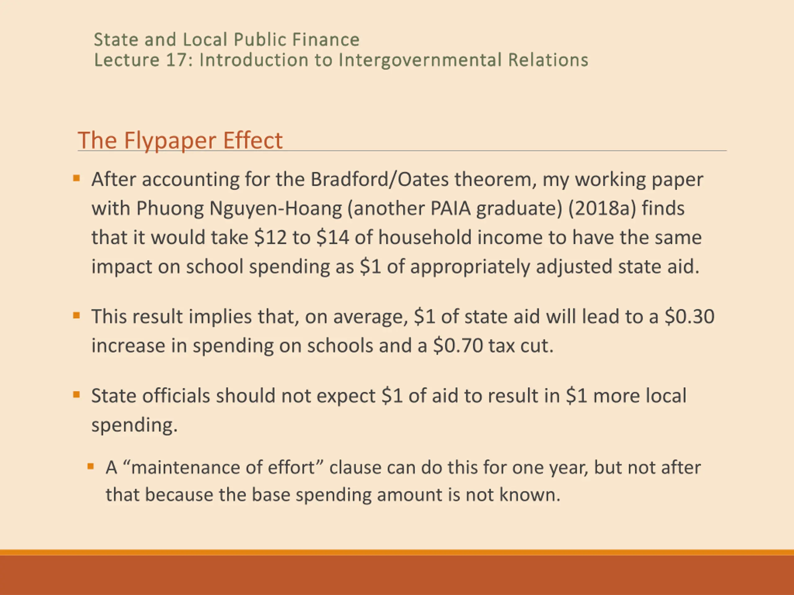 State and Local Public Finance State and Local Public Finance Lecture 17: Introduction to Intergovernmental Relations Lecture 17: Introduction to Intergovernmental Relations The Flypaper Effect After accounting for the Bradford/Oates theorem, my working paper with Phuong Nguyen-Hoang (another PAIA graduate) (2018a) finds that it would take $12 to $14 of household income to have the same impact on school spending as $1 of appropriately adjusted state aid. This result implies that, on average, $1 of state aid will lead to a $0.30 increase in spending on schools and a $0.70 tax cut. State officials should not expect $1 of aid to result in $1 more local spending. A maintenance of effort clause can do this for one year, but not after that because the base spending amount is not known.