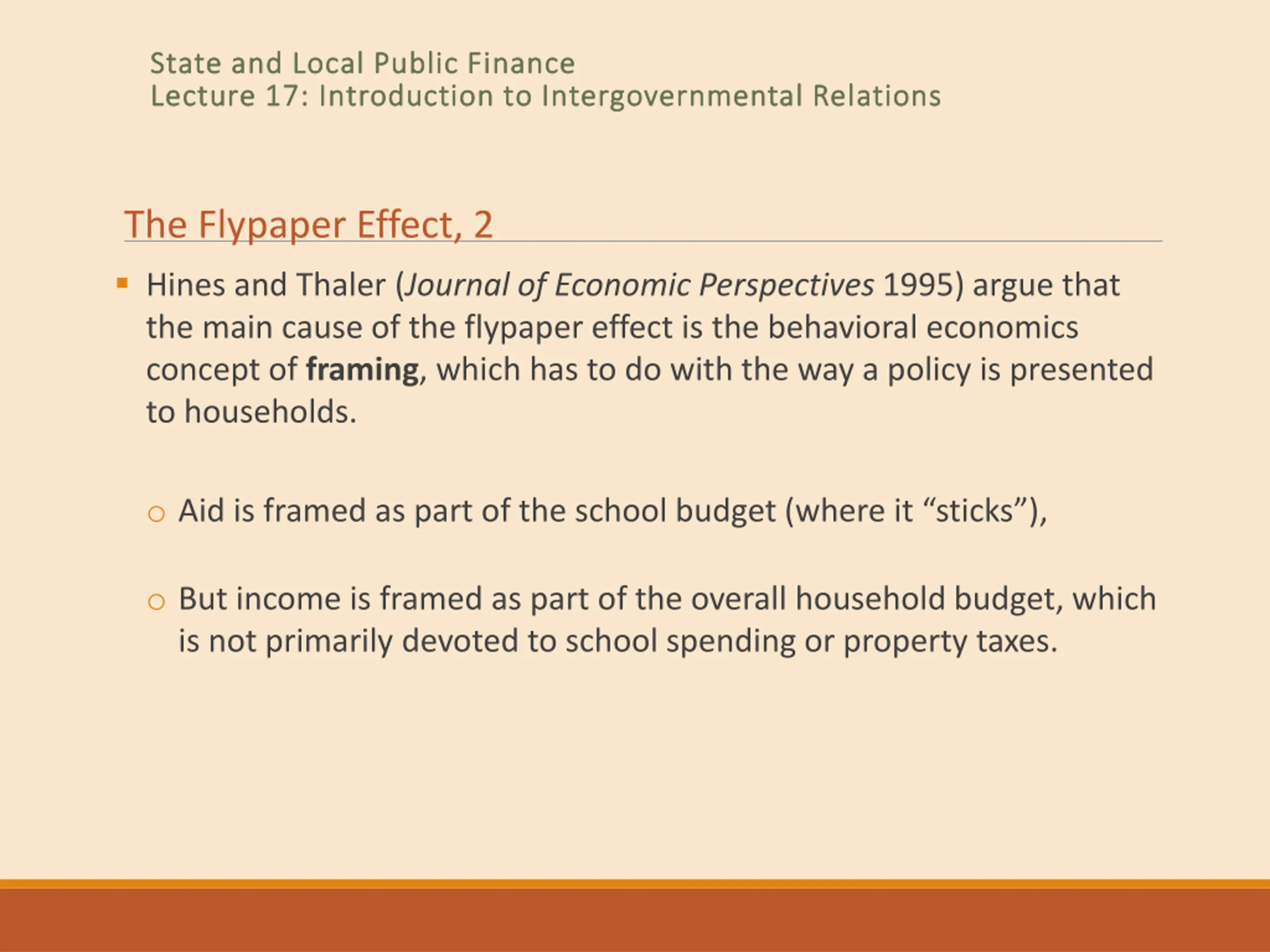 State and Local Public Finance State and Local Public Finance Lecture 17: Introduction to Intergovernmental Relations Lecture 17: Introduction to Intergovernmental Relations The Flypaper Effect, 2 Hines and Thaler (Journal of Economic Perspectives 1995) argue that the main cause of the flypaper effect is the behavioral economics concept of framing, which has to do with the way a policy is presented to households. o Aid is framed as part of the school budget (where it sticks ), o But income is framed as part of the overall household budget, which is not primarily devoted to school spending or property taxes.