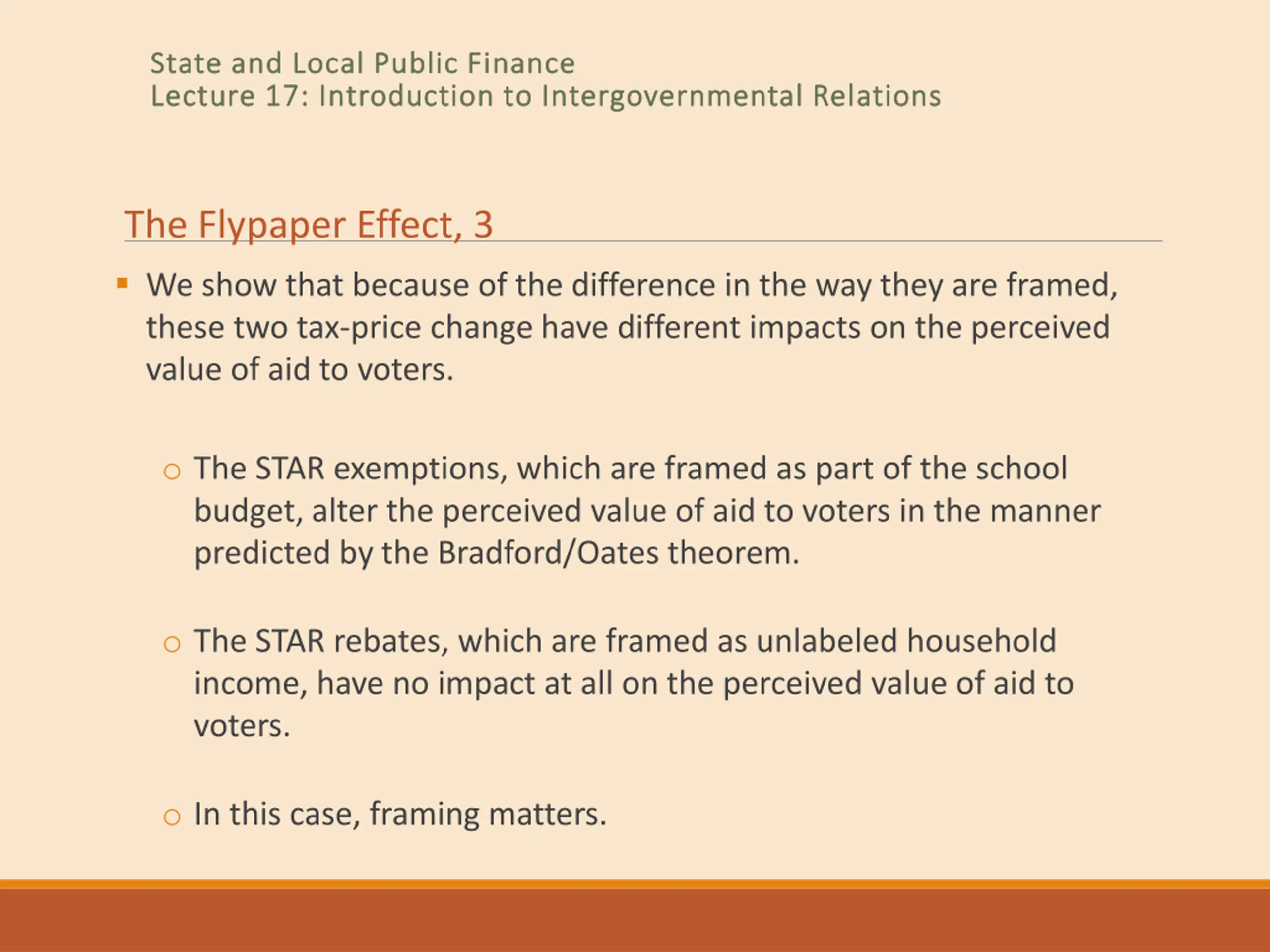 State and Local Public Finance State and Local Public Finance Lecture 17: Introduction to Intergovernmental Relations Lecture 17: Introduction to Intergovernmental Relations The Flypaper Effect, 3 We show that because of the difference in the way they are framed, these two tax-price change have different impacts on the perceived value of aid to voters. o The STAR exemptions, which are framed as part of the school budget, alter the perceived value of aid to voters in the manner predicted by the Bradford/Oates theorem. o The STAR rebates, which are framed as unlabeled household income, have no impact at all on the perceived value of aid to voters. o In this case, framing matters.