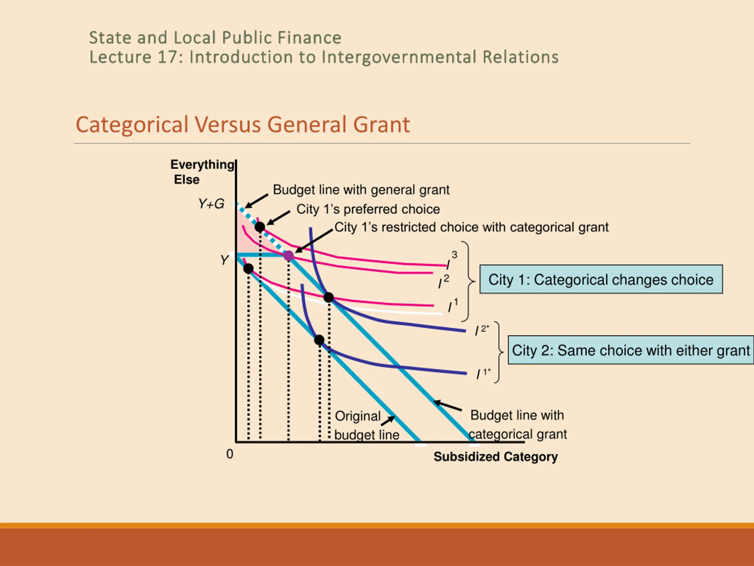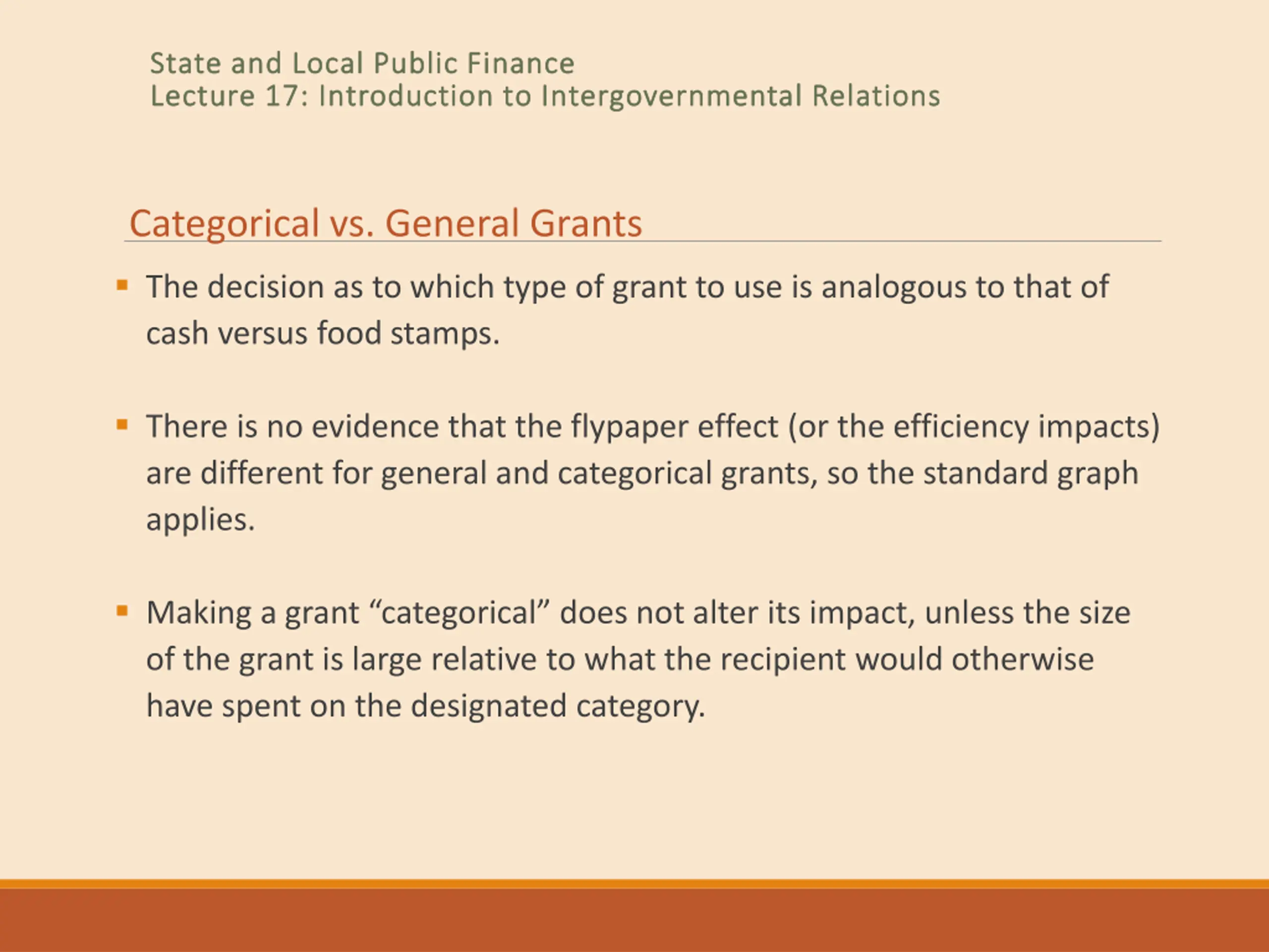 State and Local Public Finance State and Local Public Finance Lecture 17: Introduction to Intergovernmental Relations Lecture 17: Introduction to Intergovernmental Relations Categorical vs. General Grants The decision as to which type of grant to use is analogous to that of cash versus food stamps. There is no evidence that the flypaper effect (or the efficiency impacts) are different for general and categorical grants, so the standard graph applies. Making a grant categorical does not alter its impact, unless the size of the grant is large relative to what the recipient would otherwise have spent on the designated category.