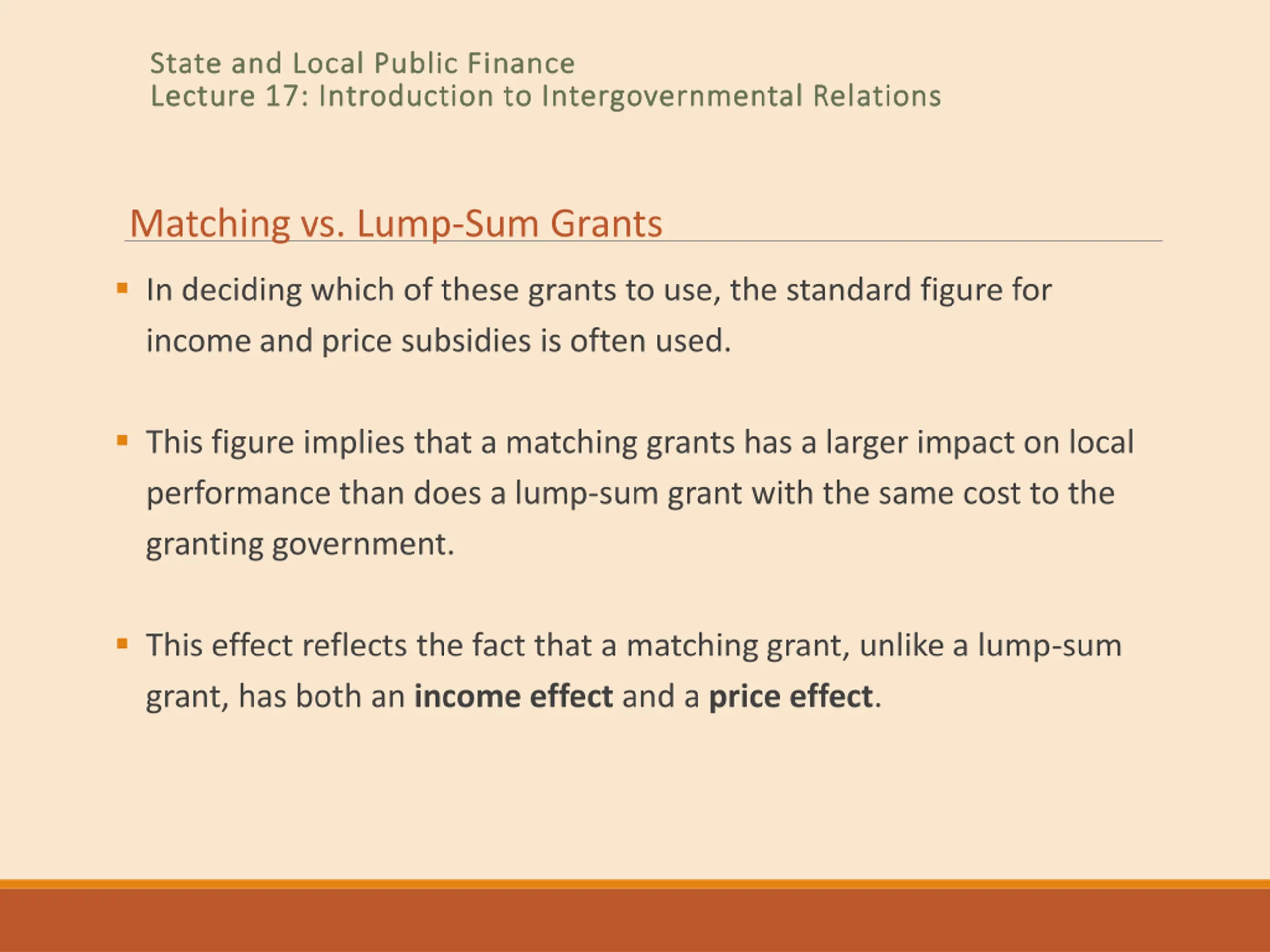 State and Local Public Finance State and Local Public Finance Lecture 17: Introduction to Intergovernmental Relations Lecture 17: Introduction to Intergovernmental Relations Matching vs. Lump-Sum Grants In deciding which of these grants to use, the standard figure for income and price subsidies is often used. This figure implies that a matching grants has a larger impact on local performance than does a lump-sum grant with the same cost to the granting government. This effect reflects the fact that a matching grant, unlike a lump-sum grant, has both an income effect and a price effect.