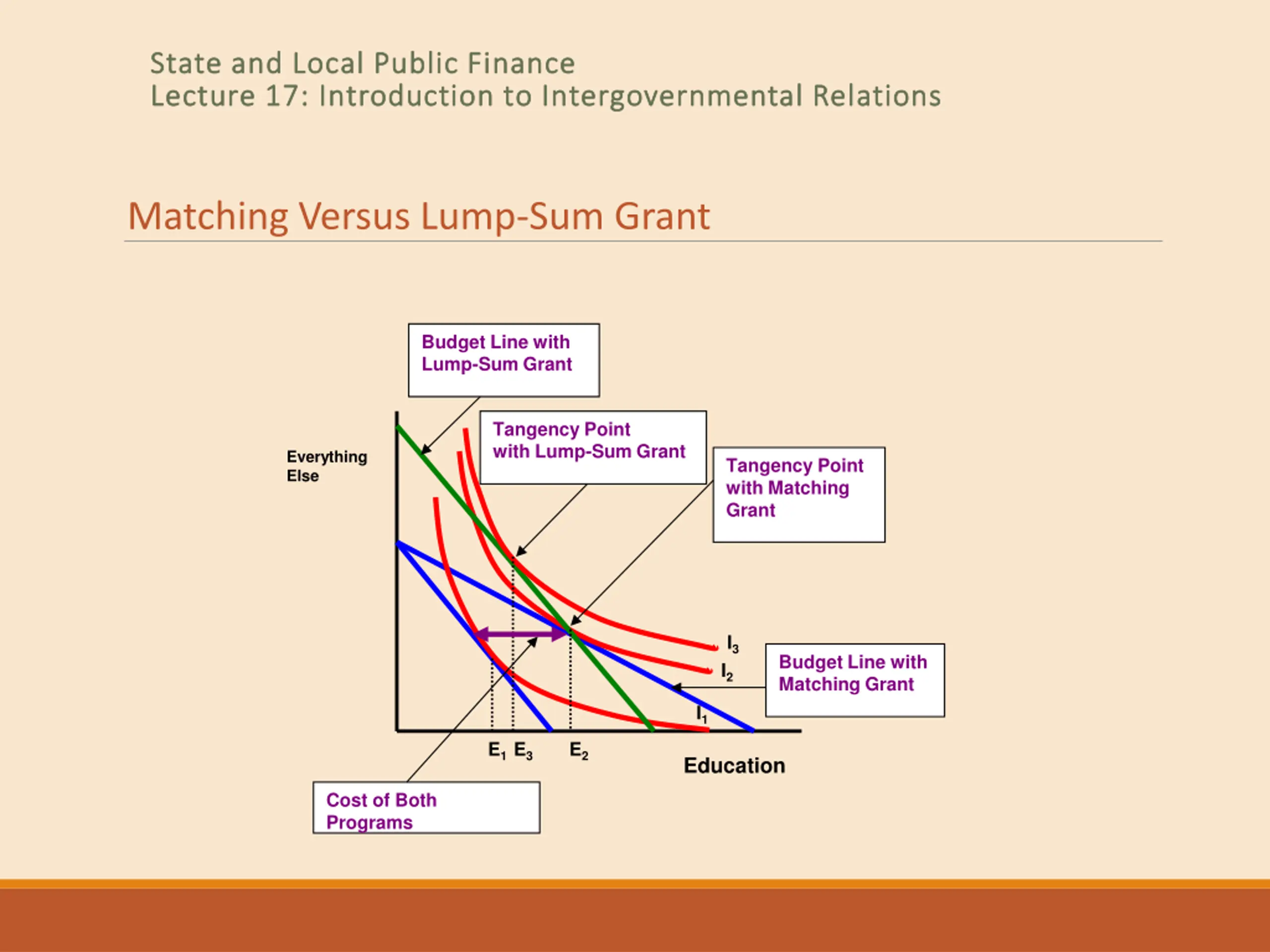 State and Local Public Finance State and Local Public Finance Lecture 17: Introduction to Intergovernmental Relations Lecture 17: Introduction to Intergovernmental Relations Matching Versus Lump-Sum Grant Budget Line with Lump-Sum Grant Tangency Point with Lump-Sum Grant Everything Else Tangency Point with Matching Grant I3 Budget Line with Matching Grant I2 I1 E1E3 E2 Education Cost of Both Programs