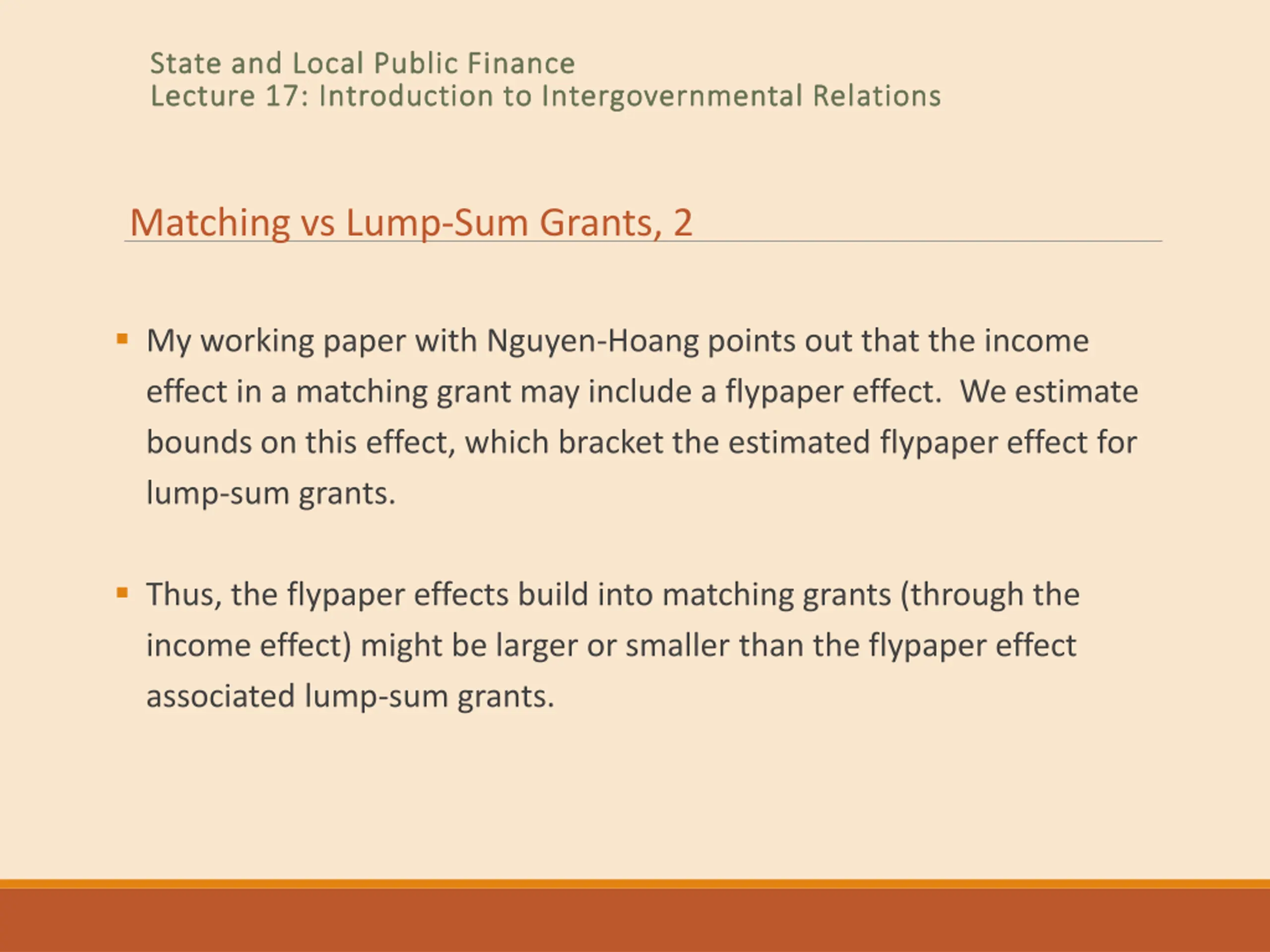 State and Local Public Finance State and Local Public Finance Lecture 17: Introduction to Intergovernmental Relations Lecture 17: Introduction to Intergovernmental Relations Matching vs Lump-Sum Grants, 2 My working paper with Nguyen-Hoang points out that the income effect in a matching grant may include a flypaper effect. We estimate bounds on this effect, which bracket the estimated flypaper effect for lump-sum grants. Thus, the flypaper effects build into matching grants (through the income effect) might be larger or smaller than the flypaper effect associated lump-sum grants.