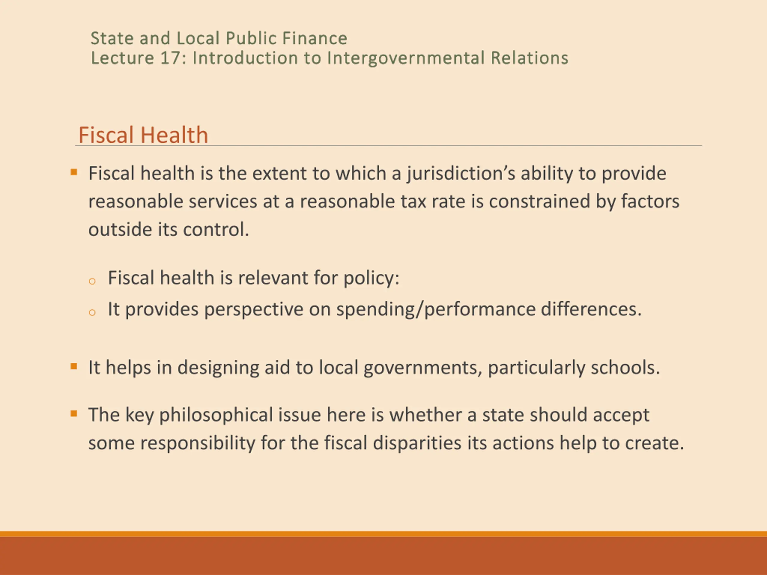State and Local Public Finance State and Local Public Finance Lecture 17: Introduction to Intergovernmental Relations Lecture 17: Introduction to Intergovernmental Relations Fiscal Health Fiscal health is the extent to which a jurisdiction s ability to provide reasonable services at a reasonable tax rate is constrained by factors outside its control. o Fiscal health is relevant for policy: o It provides perspective on spending/performance differences. It helps in designing aid to local governments, particularly schools. The key philosophical issue here is whether a state should accept some responsibility for the fiscal disparities its actions help to create.