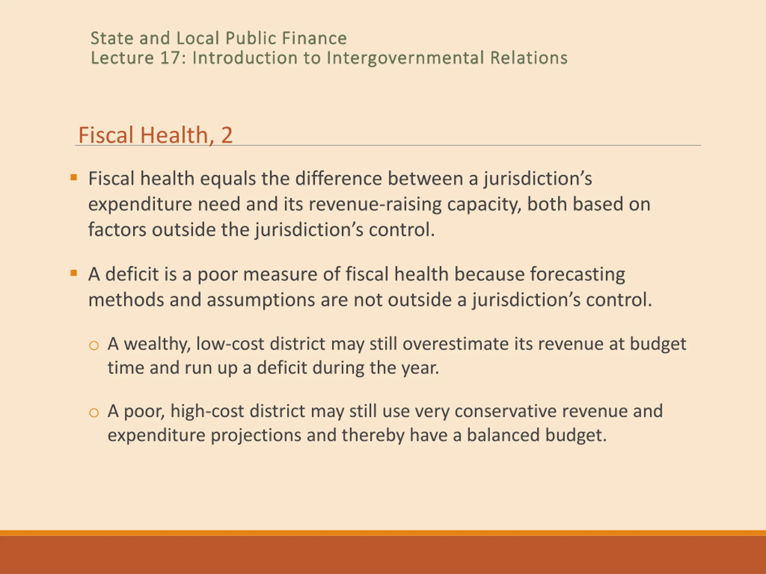 State and Local Public Finance State and Local Public Finance Lecture 17: Introduction to Intergovernmental Relations Lecture 17: Introduction to Intergovernmental Relations Fiscal Health, 2 Fiscal health equals the difference between a jurisdiction s expenditure need and its revenue-raising capacity, both based on factors outside the jurisdiction s control. A deficit is a poor measure of fiscal health because forecasting methods and assumptions are not outside a jurisdiction s control. o A wealthy, low-cost district may still overestimate its revenue at budget time and run up a deficit during the year. o A poor, high-cost district may still use very conservative revenue and expenditure projections and thereby have a balanced budget.