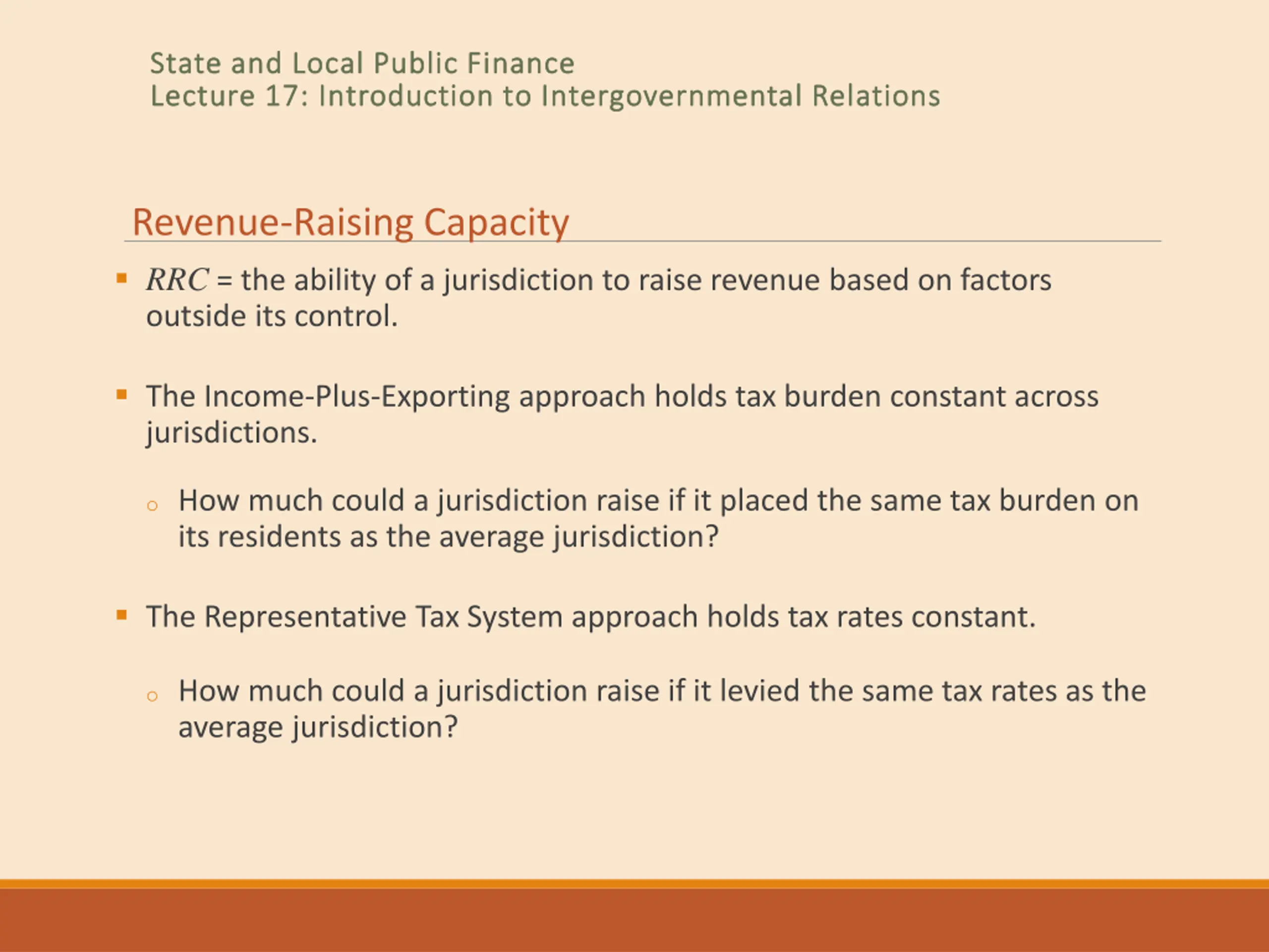 State and Local Public Finance State and Local Public Finance Lecture 17: Introduction to Intergovernmental Relations Lecture 17: Introduction to Intergovernmental Relations Revenue-Raising Capacity RRC = the ability of a jurisdiction to raise revenue based on factors outside its control. The Income-Plus-Exporting approach holds tax burden constant across jurisdictions. o How much could a jurisdiction raise if it placed the same tax burden on its residents as the average jurisdiction? The Representative Tax System approach holds tax rates constant. o How much could a jurisdiction raise if it levied the same tax rates as the average jurisdiction?