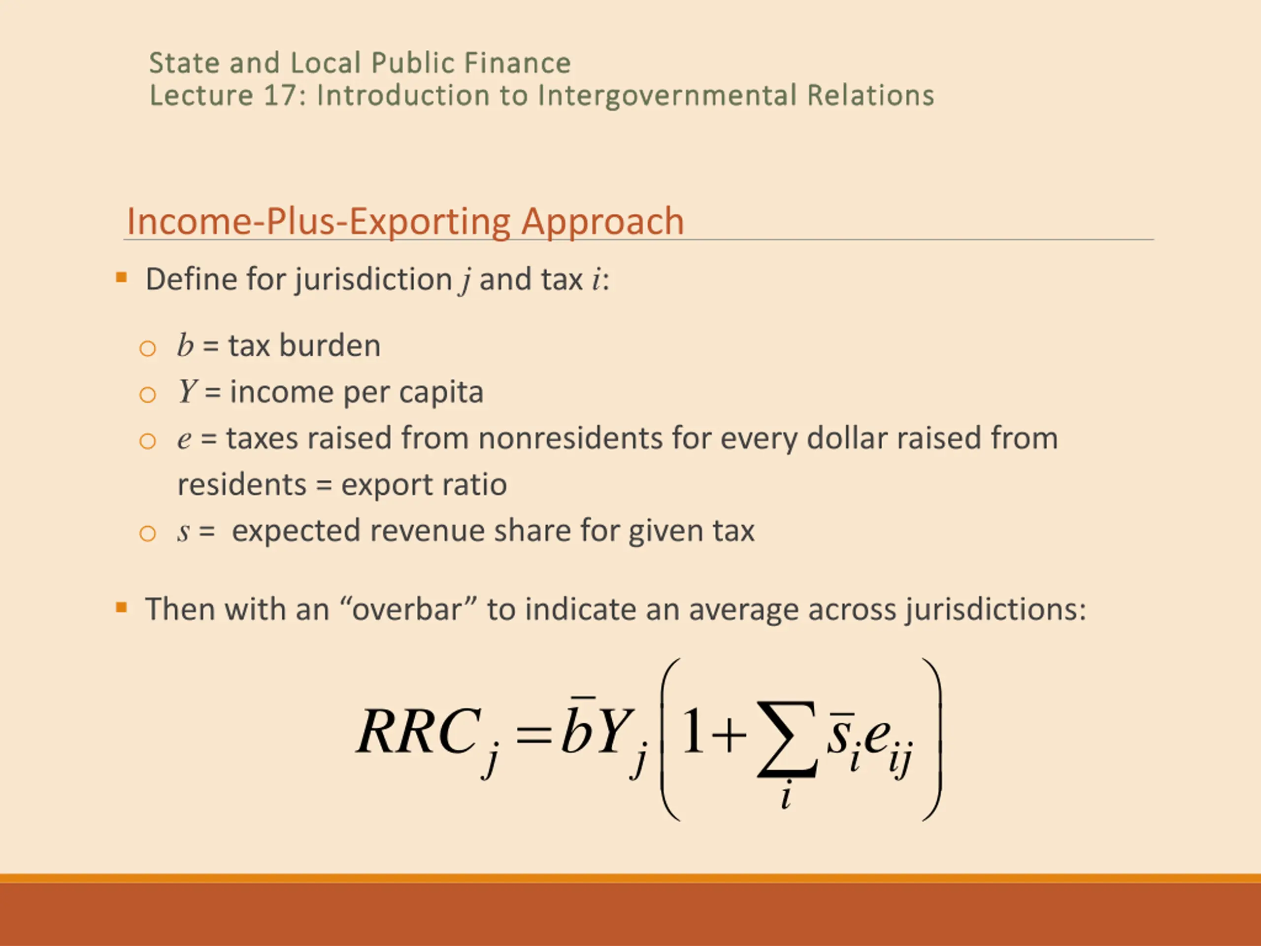 State and Local Public Finance State and Local Public Finance Lecture 17: Introduction to Intergovernmental Relations Lecture 17: Introduction to Intergovernmental Relations Income-Plus-Exporting Approach Define for jurisdiction j and tax i: o b = tax burden o Y = income per capita o e = taxes raised from nonresidents for every dollar raised from residents = export ratio o s = expected revenue share for given tax Then with an overbar to indicate an average across jurisdictions: + = 1 RRC bY i ij se j j i
