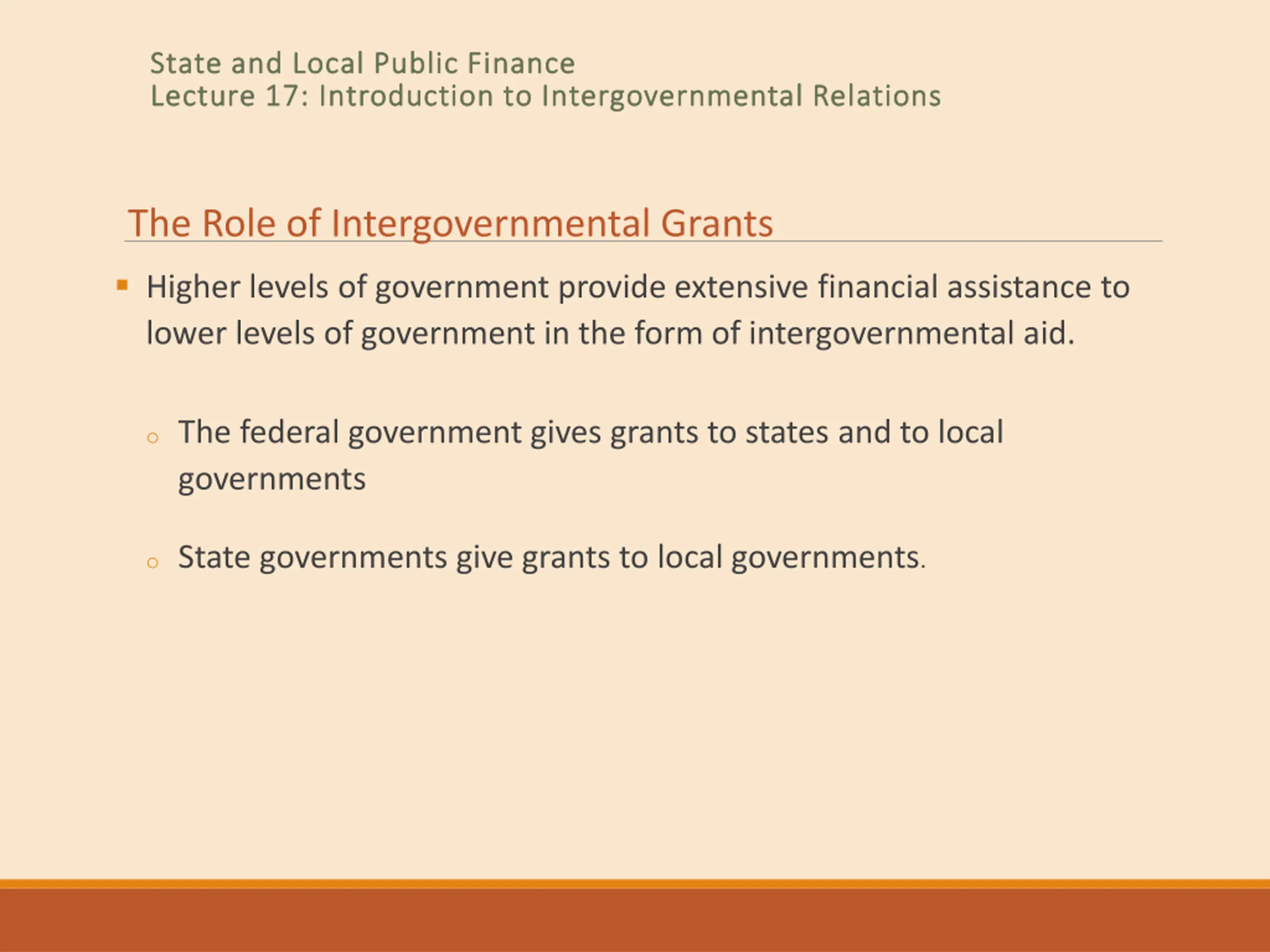State and Local Public Finance State and Local Public Finance Lecture 17: Introduction to Intergovernmental Relations Lecture 17: Introduction to Intergovernmental Relations The Role of Intergovernmental Grants Higher levels of government provide extensive financial assistance to lower levels of government in the form of intergovernmental aid. o The federal government gives grants to states and to local governments o State governments give grants to local governments.