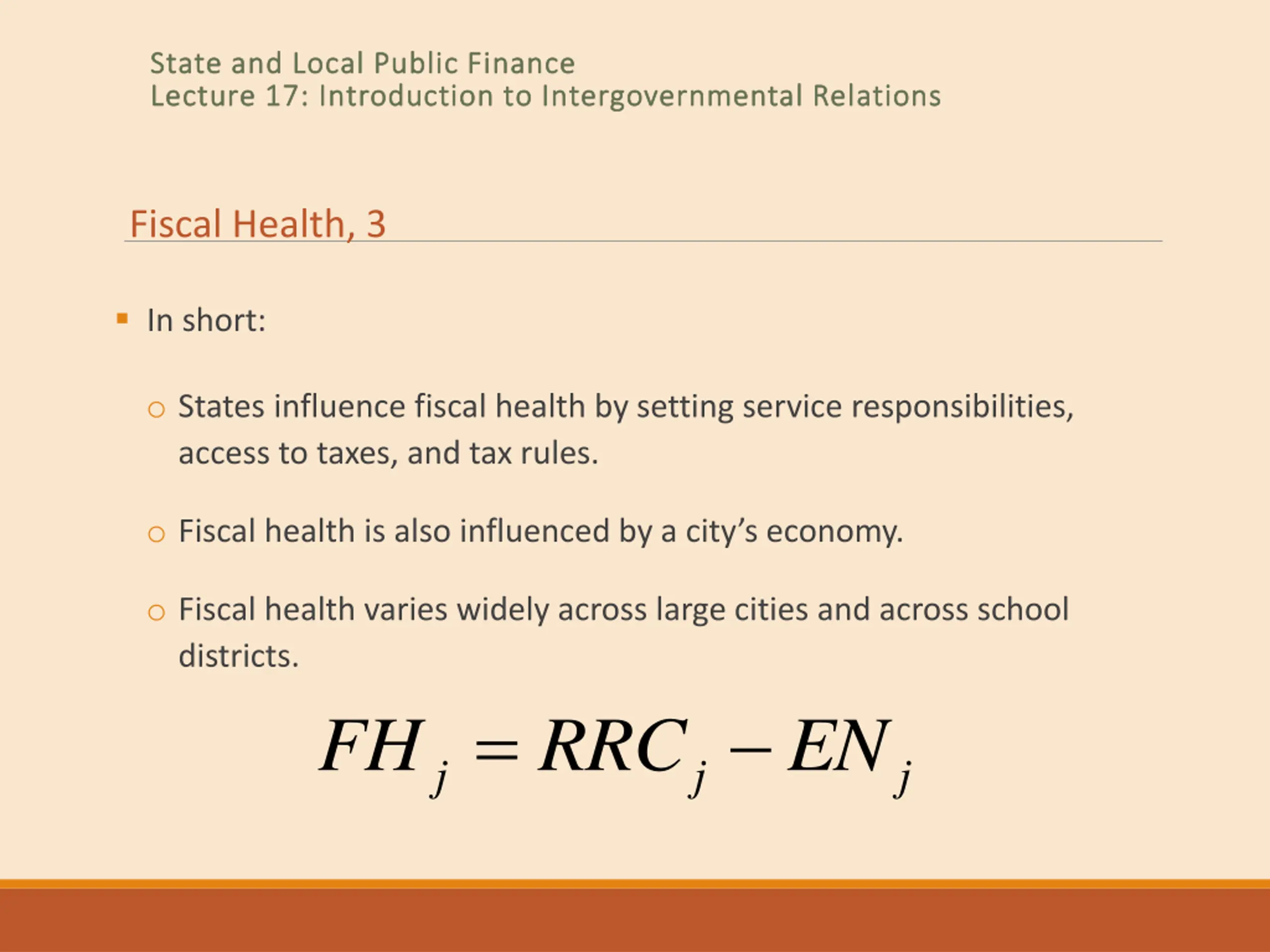 State and Local Public Finance State and Local Public Finance Lecture 17: Introduction to Intergovernmental Relations Lecture 17: Introduction to Intergovernmental Relations Fiscal Health, 3 In short: o States influence fiscal health by setting service responsibilities, access to taxes, and tax rules. o Fiscal health is also influenced by a city s economy. o Fiscal health varies widely across large cities and across school districts. FH RRC = EN j j j